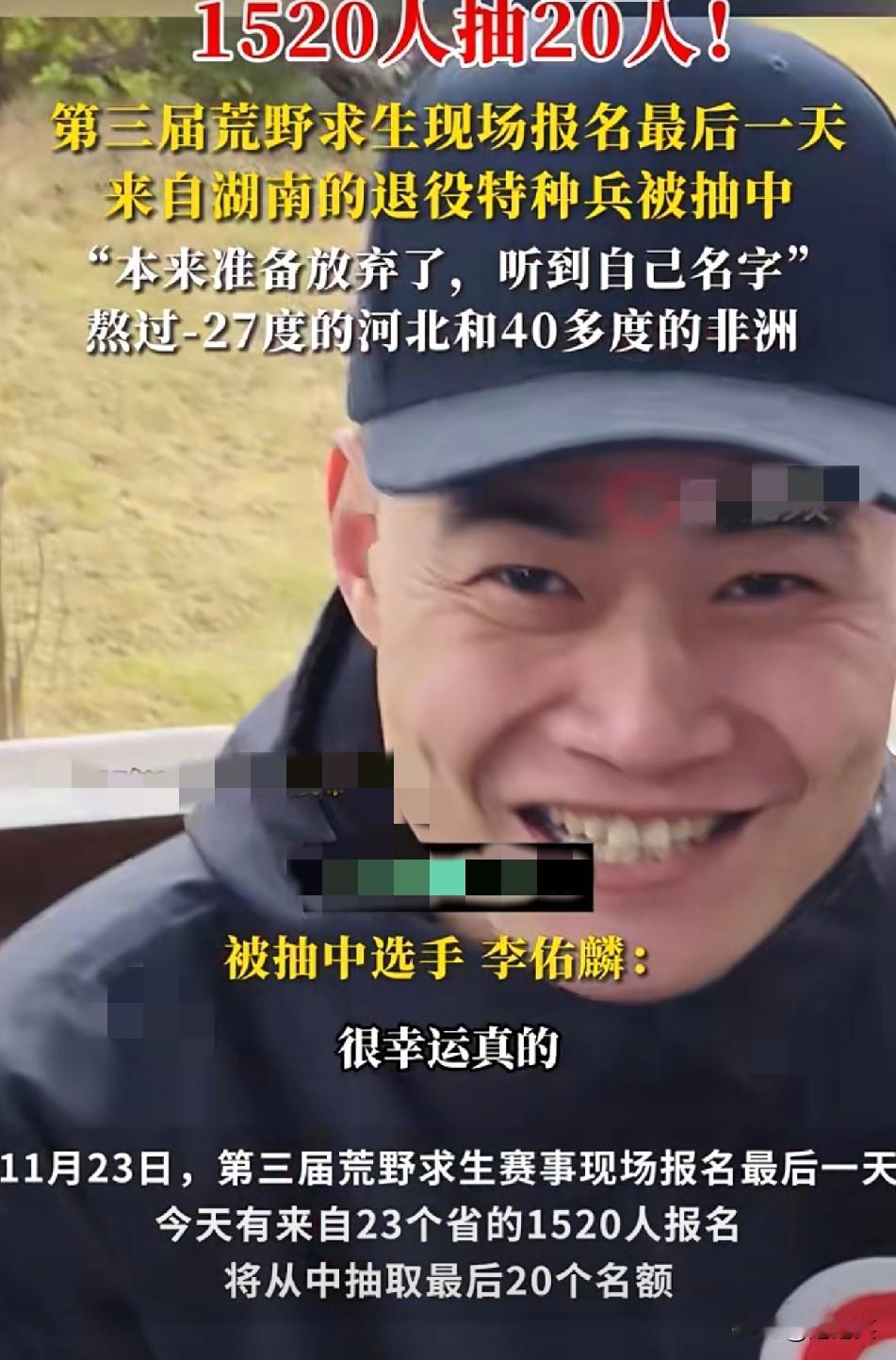 杀疯了! 荒野赛1520人抢60个名额 退役特种兵抽中时竟要放弃? 第三届荒野求生赛报名太卷了! 23省1520人挤现场抽签,只抢20个名额,后续还有40个网报名额 湖南退役特种兵李佑麟都准备走了,突然听到自己名字,当场确认入选 要知道他扛过-27℃河北寒冬,闯过40℃+非洲酷暑,这生存实力简直拉满 首届冠军还亲自到场打气 网友直呼“这才是天选选手”! 可1520人选60人,到底是拼运气还是拼硬实力?普通人参赛真能有机会吗
