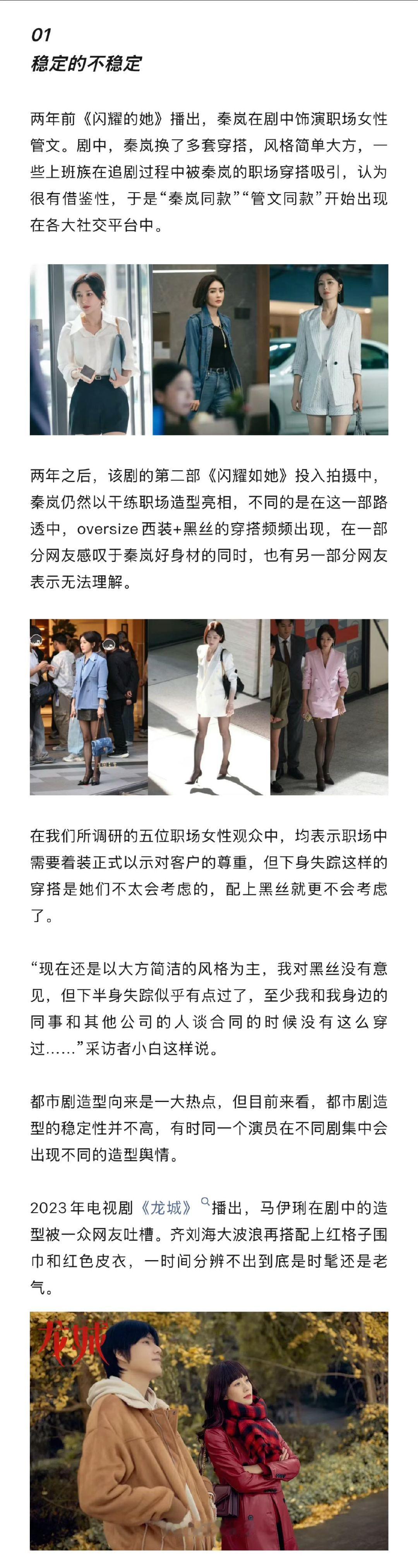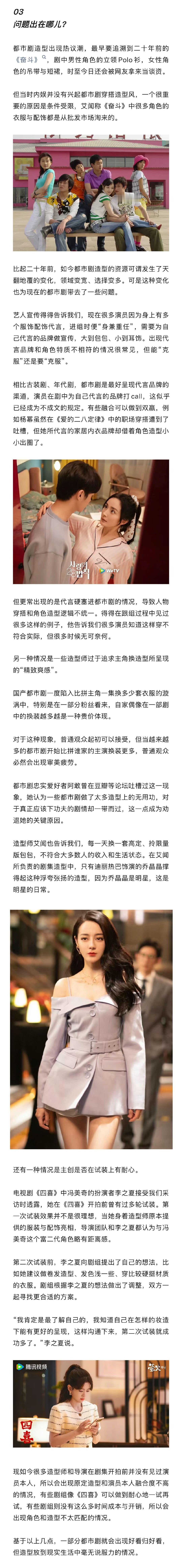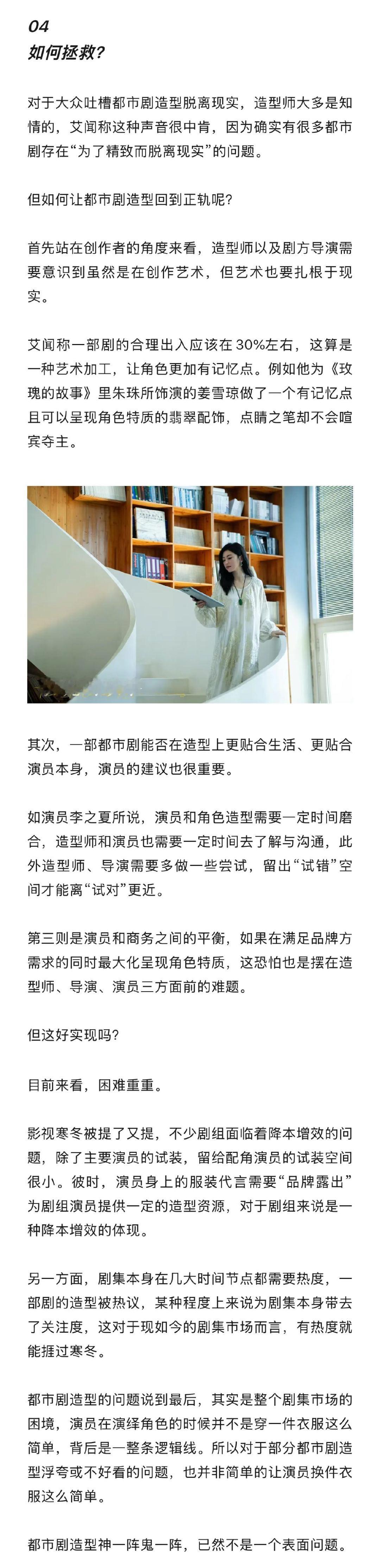 艺人工作人员表示如今不少演员所代言的品牌强行进组,造成角色穿搭不符现实的情况。但不少剧组面临降本增效的问题,品牌进组宛如及时雨。可见都市剧造型的问题并非是表面问题,更是整个剧集大环境的问题。