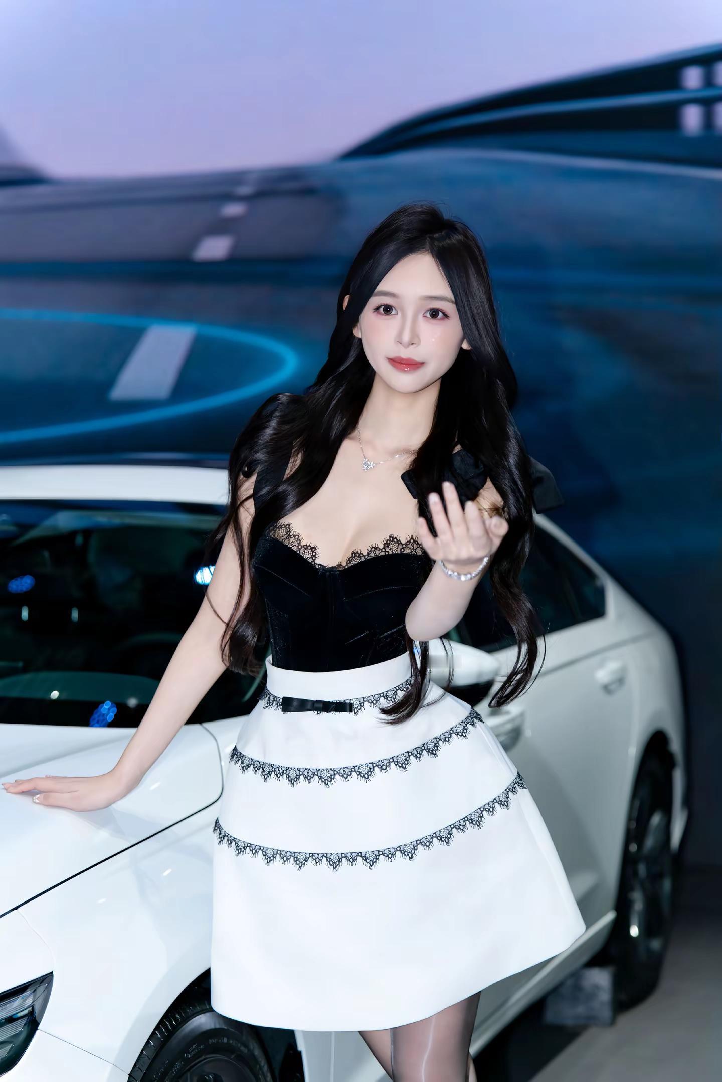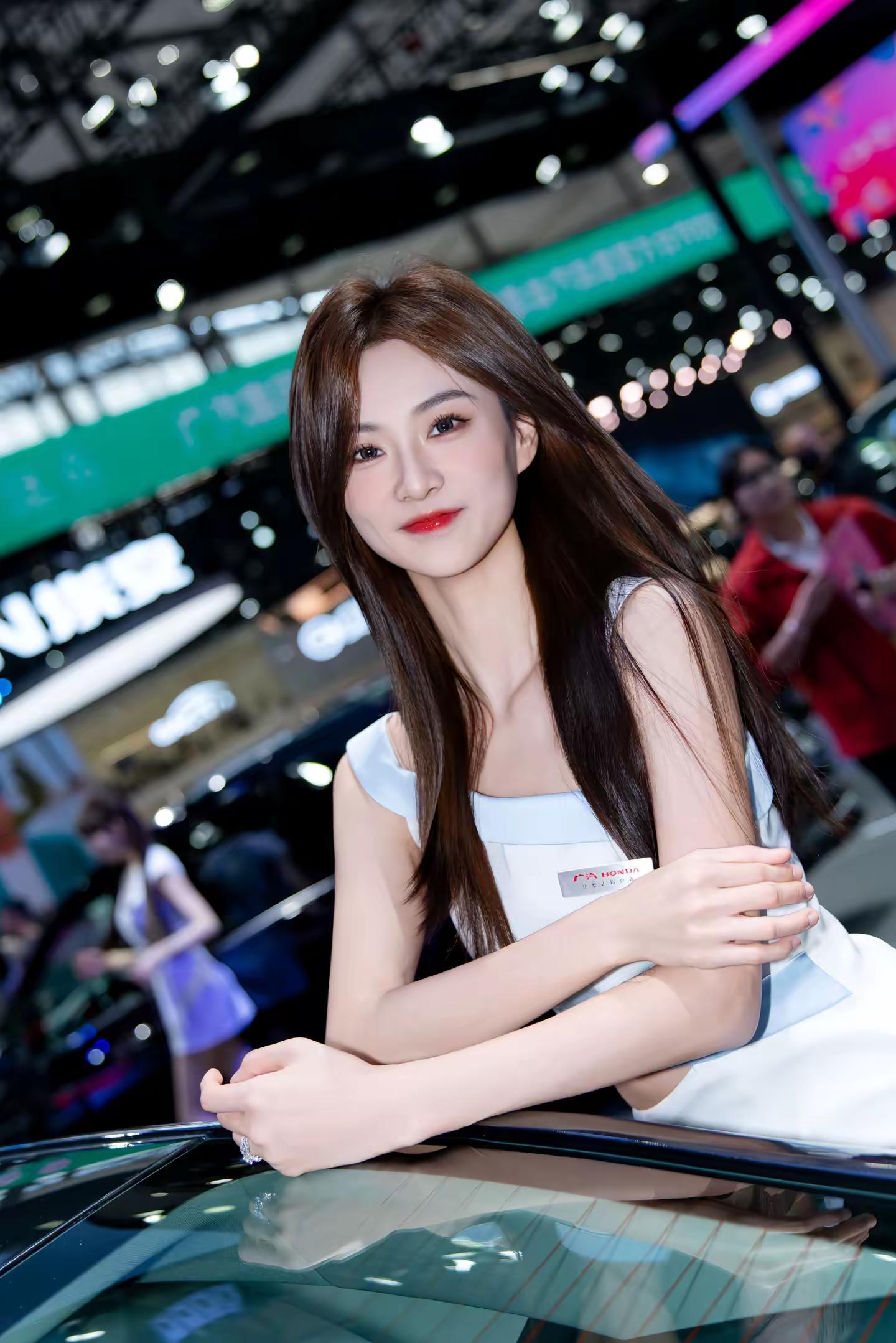 2025上海车展车模任绵绵 一个好看的小姐姐, 穿的白底带蓝花的改良旗...