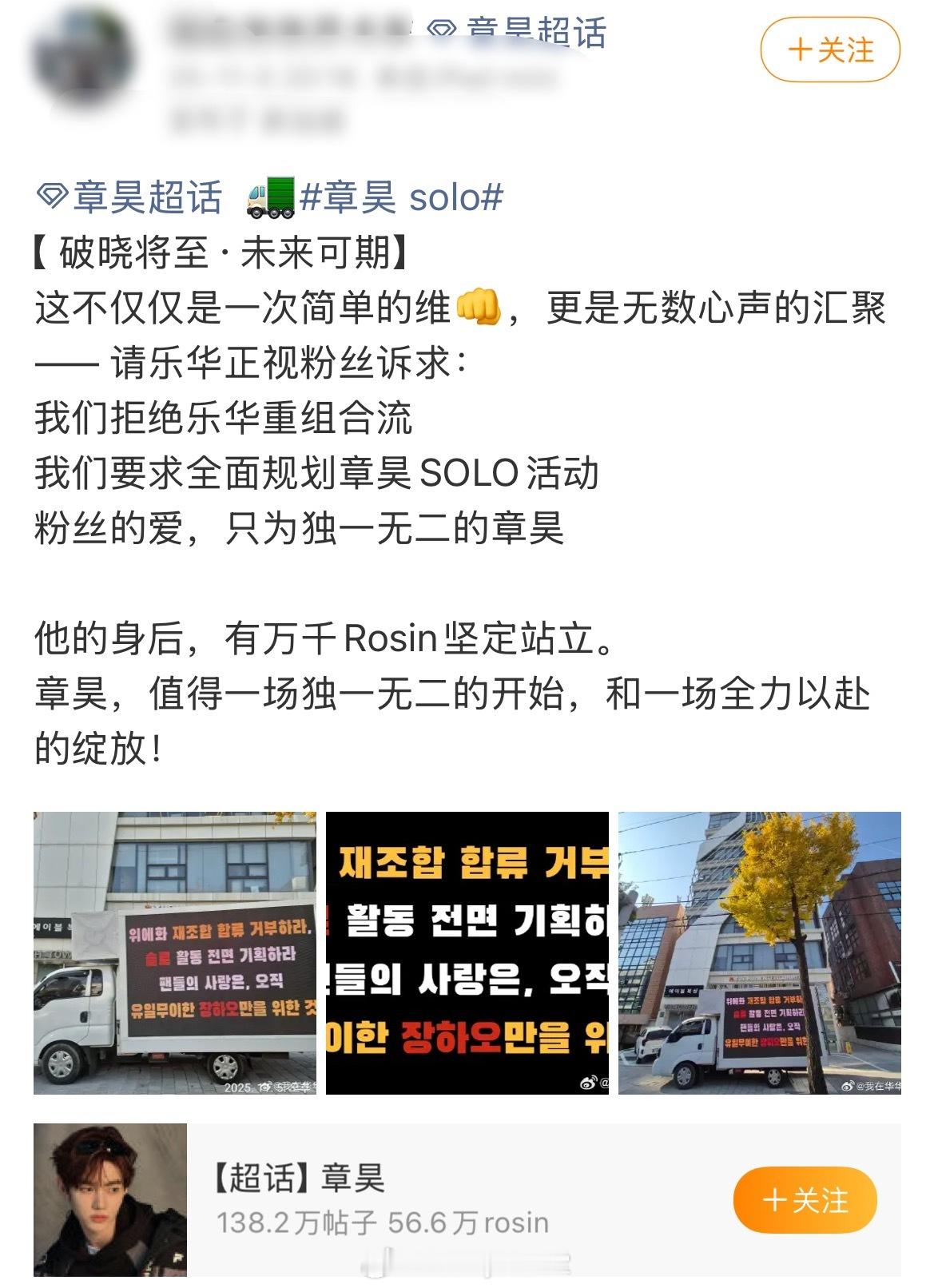 章昊粉丝再次进行卡车维权,要求章昊solo,拒绝组合重组!如果solo出道的话,会回内娱吗