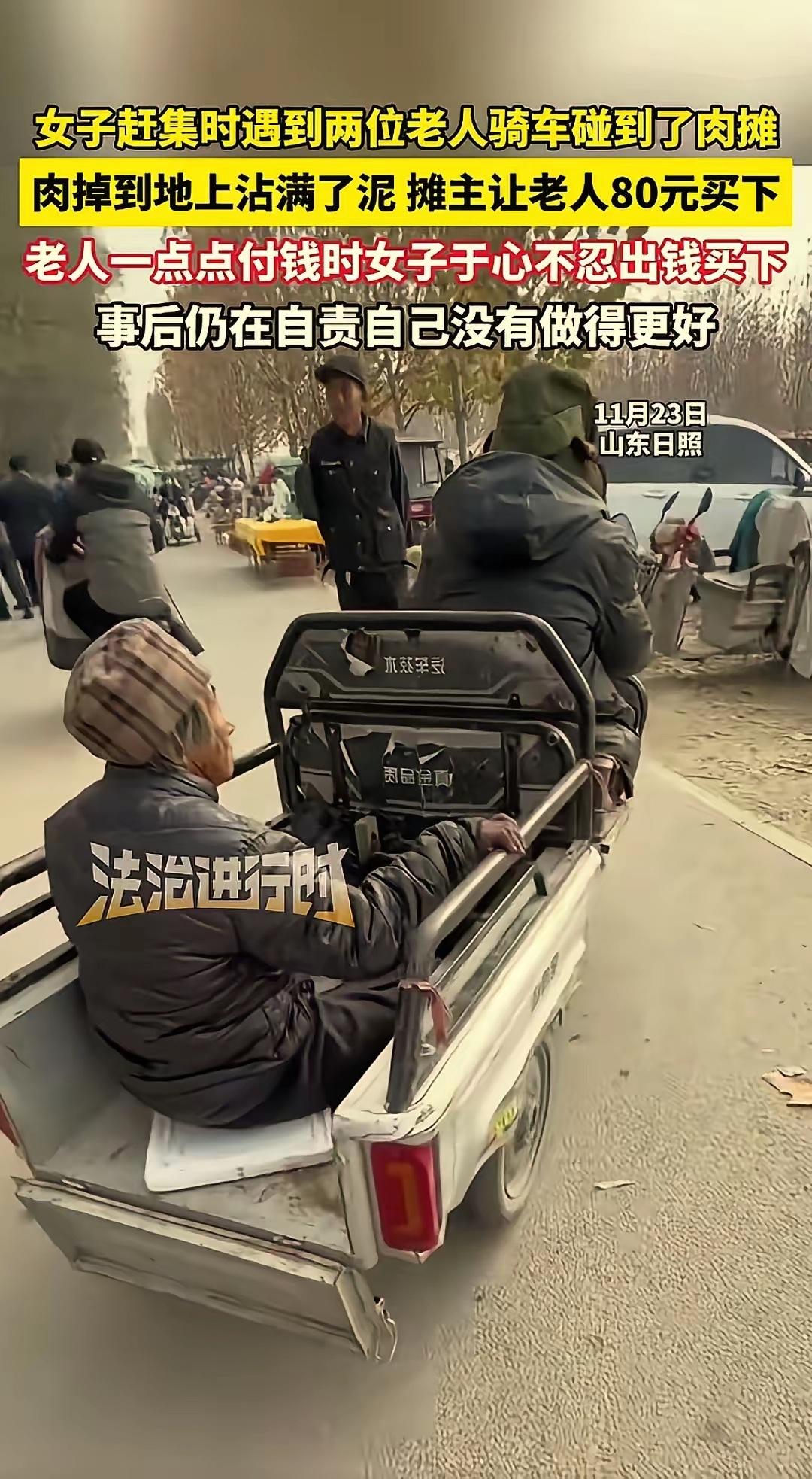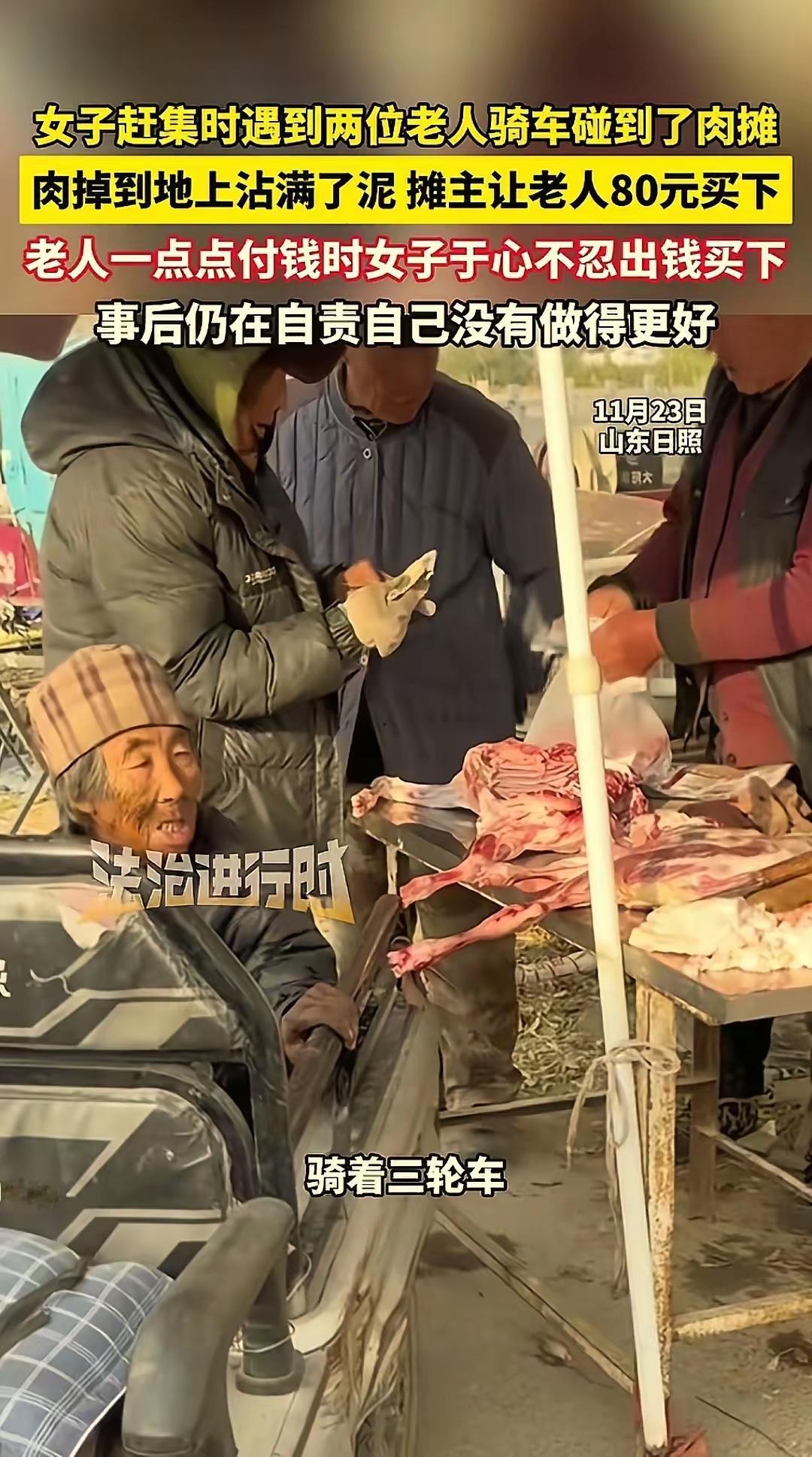 太感人了!山东日照集市一幕暖到心底,大爷骑三轮车带老伴赶集,不小心蹭掉肉摊一块肉,摊主让付80元买下,大爷攥着一把零钱数半天,最大面值才10块,凑得满脸窘迫,车里大娘默默看着,满是心酸。 路过女子见不得老人为难,直接上前揽下账单,掏80元买下带泥的肉,让摊主把零钱还给大爷。摊主没亏本钱,老人没耗光家用,女子一句解围,既顾全双方难处,更护了老人体面。事后女子还自责没多帮老人买点东西,这份发自本心的善意,比刻意行善更打动人。 善良从不是惊天壮举,而是见人窘迫时的抬手相助。80块不多,却藏着最真的共情,不评判对错、不纠结得失,只愿帮人熬过眼前难,这样的细碎温暖,才让平凡日子有了温度。换作是你,遇到这样的场景会伸手帮忙吗?