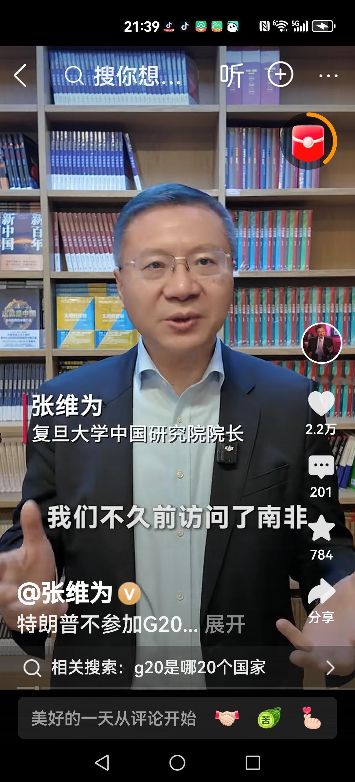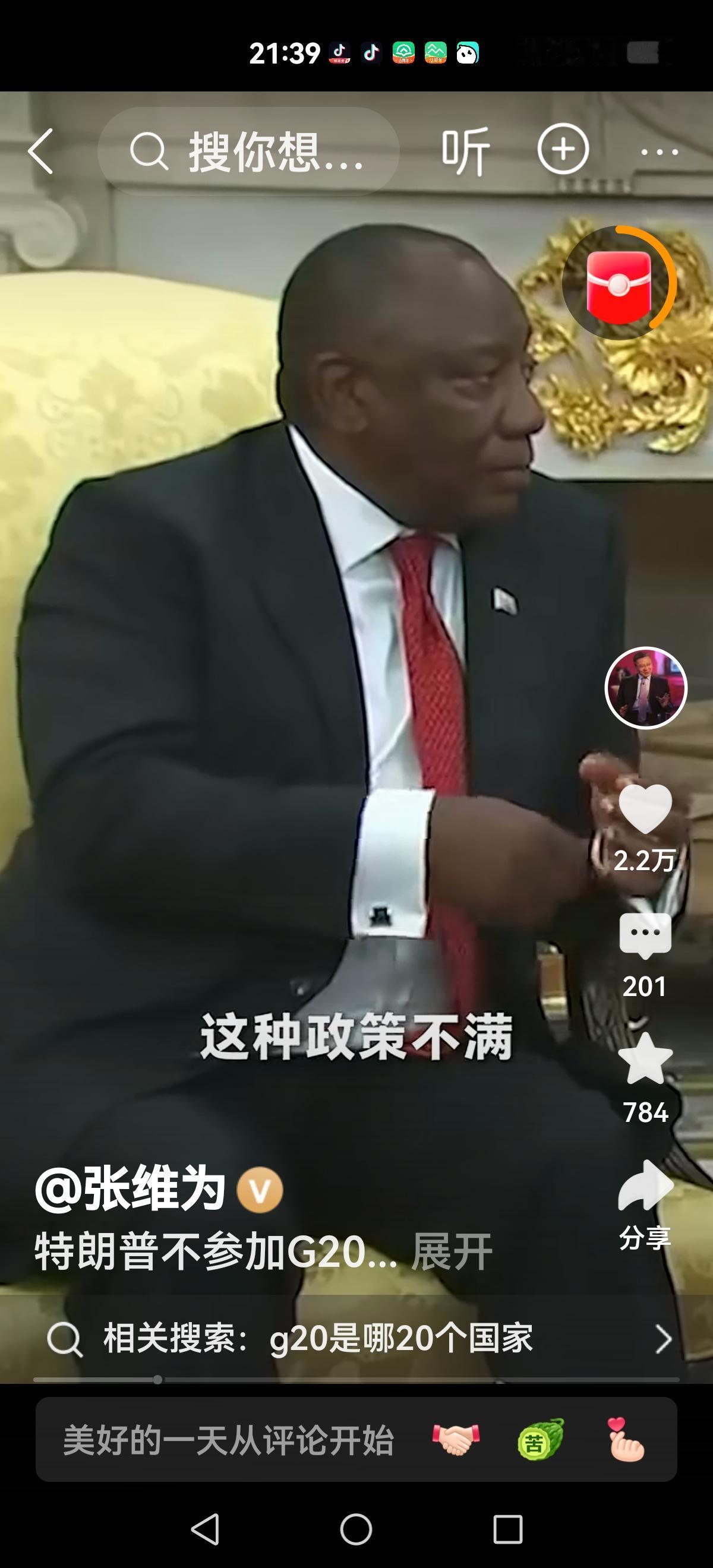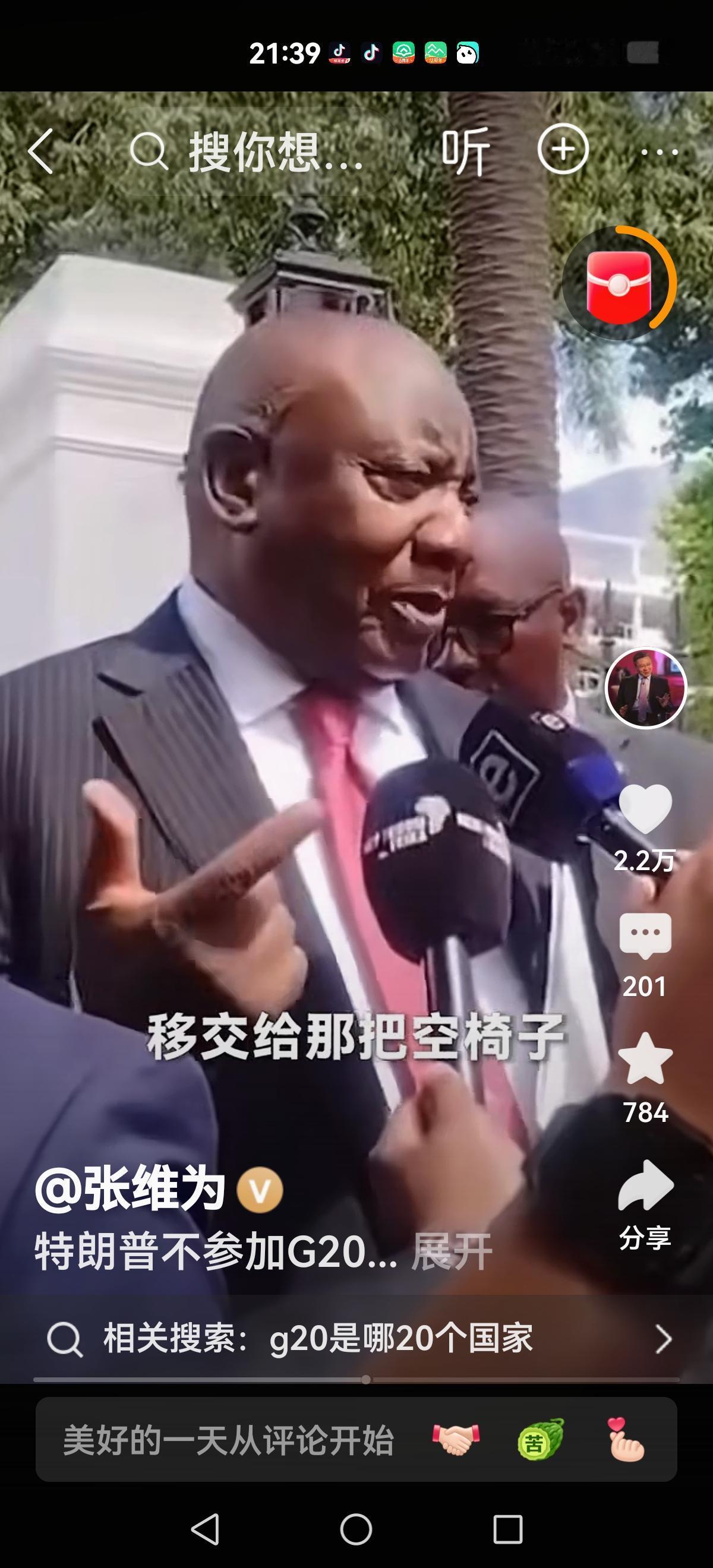 【能自嗨到这种深度?】 南非曾经是非洲的一颗明珠,然而曼德拉当选后,南非开始一路下滑,如今成为贫穷落后,问题很多的国家。 这不是曼德拉的错,是民众选举他,但 他的确没有能力带领南非走向辉煌。 特朗普不出席G20,表面是对南非看不起白人不满,其实是在对某些旧的圈子,经济体逐一剥离,是想建立新的体系,目的大家都懂。 就是这样的局面,作为智库的领路人却在哪里滔滔不绝激动说:南非总统移交下一届承办国美国,而美国总统没有去,因而南非总统故意设立一把空椅子,说移交给这把空椅子。 连南非总统都可以调侃美国总统,说明美国不重要,不来更好,省的捣乱,美国被边缘化。 这种肤浅认知,还底气十足津津乐道,真的是自嗨到家了,南非总统的无奈与悲凉,被美国晾在一边,本应深刻分析这里面的危机与风险,没想到竟然美国不重要了,如果不让美国去,那才是不重要,人家不去说明什么? 前不久一群国家齐聚白宫,有一位国家首相当场拍马屁,这能分析一下吗?