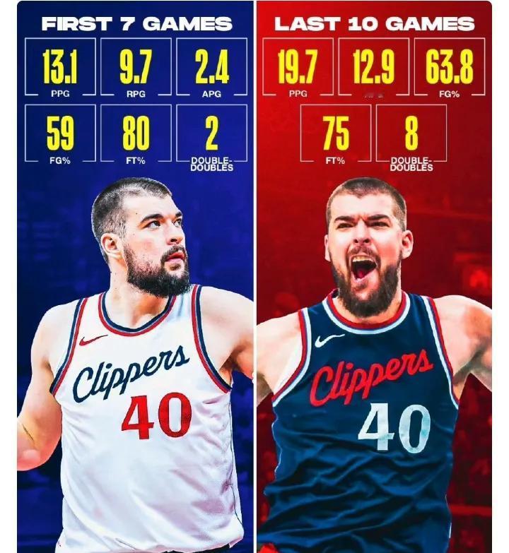 祖巴茨还是可以的 前7场13+9.7 ,近10场19.7+12.9 不过,还是不够的,毕竟走了一个上赛季场均22分的鲍威尔,目前这阵容没人能顶上。另外,数据也很难反映场上真实情况,经常失误,对手一协防不是打不进就是传球失误,就被打反击,他很难跑回来,防守端缩在内线,快船总是漏大空位三分。说白了,就是快船防守体系不够健全。