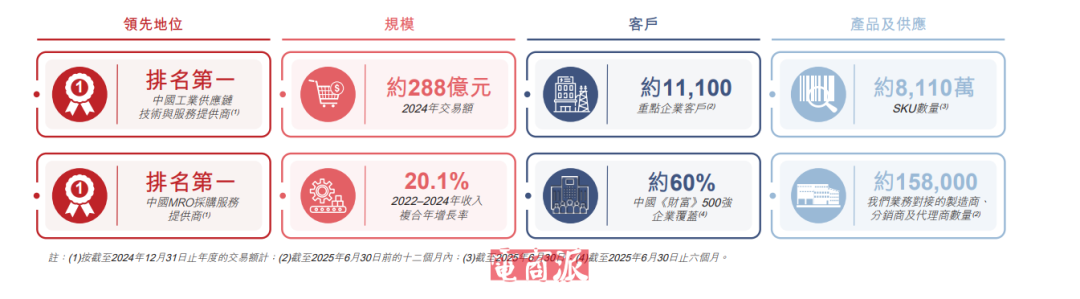 根据灼识谘询的资料显示,京东工业于2024年在中国的工业供应链技术与服务市场拥有最广泛的客户覆盖。截至2025年6月30日前的十二个月内,公司服务约11,100个重点企业客户。2025年上半年,公司的重点企业客户包括约60%的中国《财富》500强企业及逾40%的在华全球《财富》500强企业。
