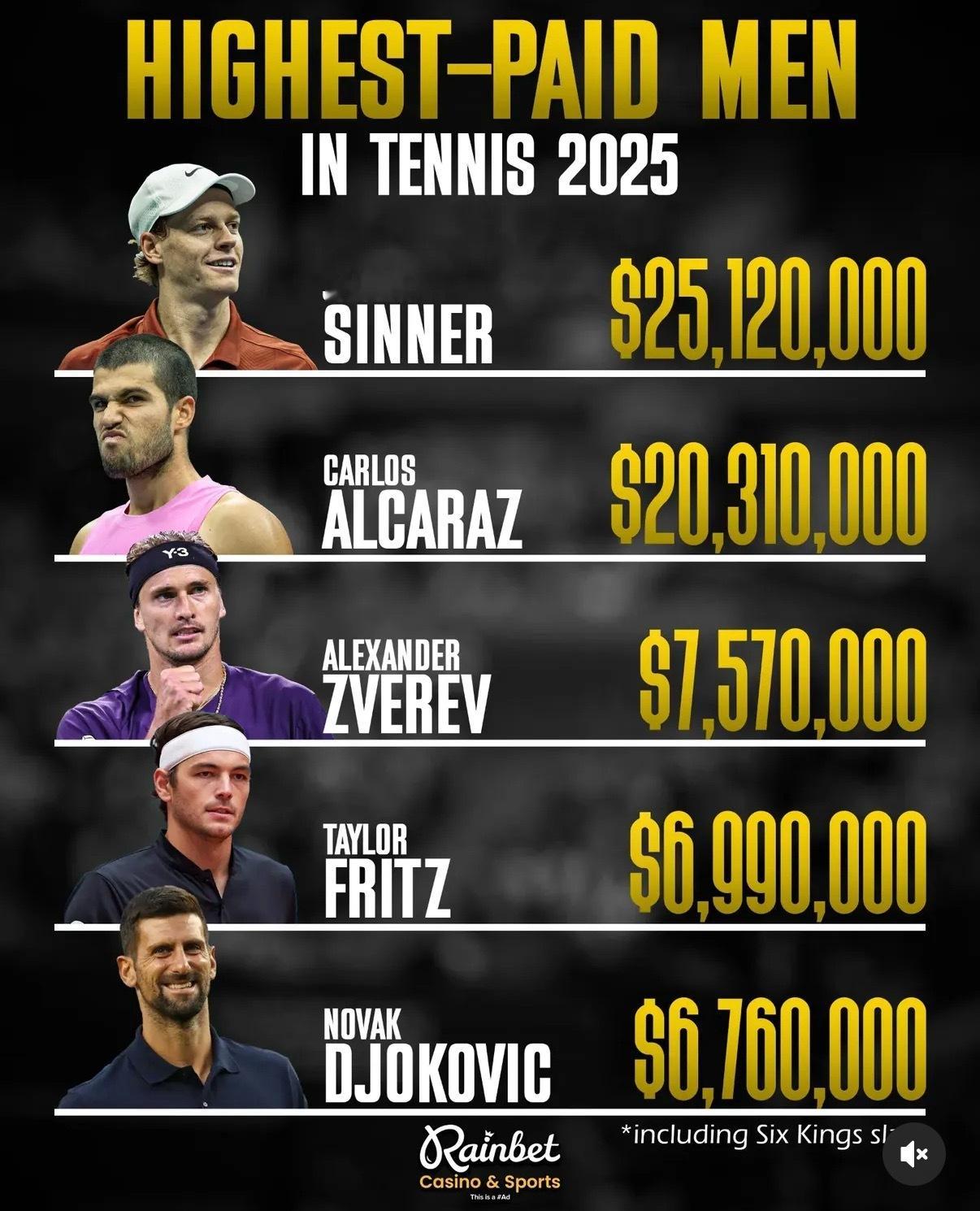 今年男网奖金(美元)收入前五(包含六王表演赛)辛纳 2512万阿尔卡拉斯 2031万兹维列夫 757万弗里茨 699万德约科维奇 676万