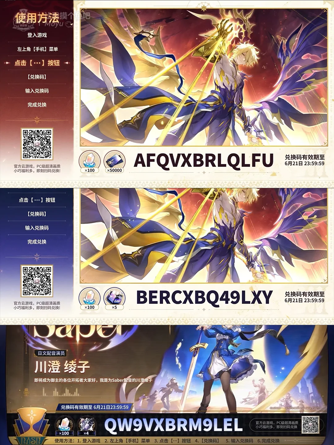 崩坏星穹铁道 崩坏星穹铁道创作者激励计划 让我摸个鱼吧Moyu 星穹铁道日更挑战 兑换码 星穹铁道翁法罗斯 星穹铁道攻略 星穹铁道前瞻 星穹铁道二周年 星穹铁道兑换码 哈喽哇!这里是你们的摸鱼酱! 崩坏星穹铁道3.4版本前瞻来啦! 就在6月20日(本周五)晚19:30与大家见面~ 新版本即将上线:【白厄】+联动卡池【Saber&红A】 有没有狠狠期待!!! 没时间看的开拓者们可以在这里插个眼O.O 摸鱼会立即给大家同步300星琼的兑换码,到时候会挨个踢~ 兑换码: 1: AFQVXBRLQLFU 2: BERCXBQ49LXY 3: QW9VXBRM9LEL 祝各位抽卡不歪,十连双金!