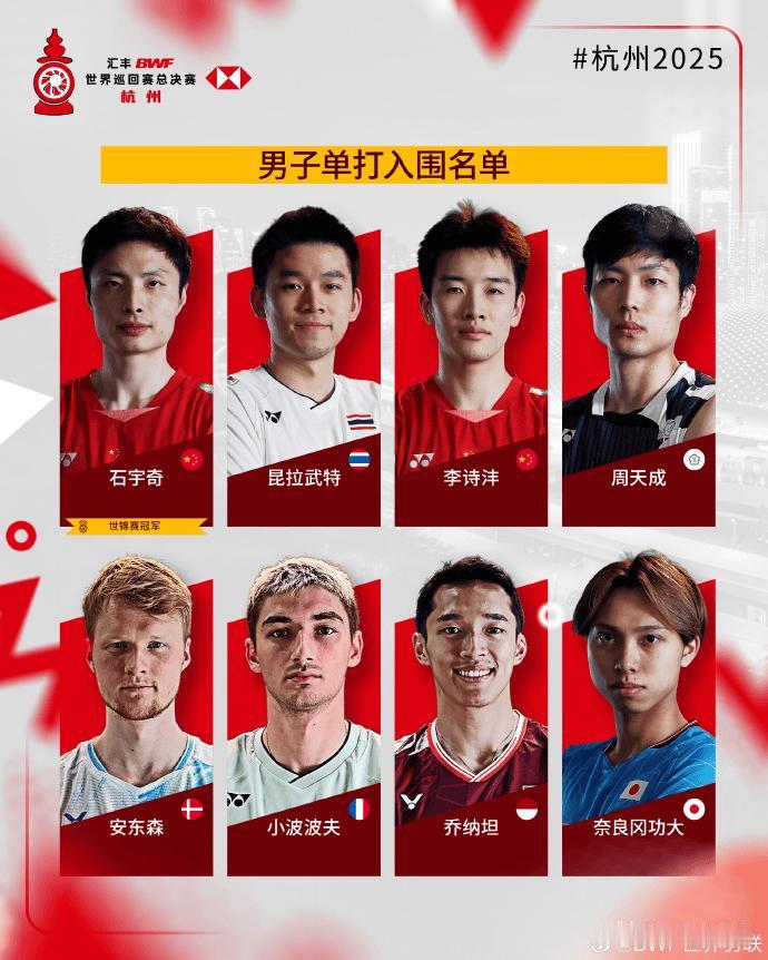 世界羽联年终总决赛入围名单出炉,国羽太猛了!除男双外其他四项均满额参赛,共获9个席位。这可是全队拼出来的,主场作战,责任更大。 男单石宇奇稳坐世界第一,以112047分的历史最高积分锁定年终第一,还是世锦赛冠军,本赛季多次让对手单局拿个位数比分。他和李诗沣双核心出战,不过对手也很强,像世锦赛亚军昆拉武特、丹麦猛将安东森。女单王祉怡和韩悦双保险,可最大对手是拿了赛季第10冠的韩国名将安洗莹。上届国羽主场拿三金,这次阵容更成熟,就看能冲几个冠军了,很是期待!