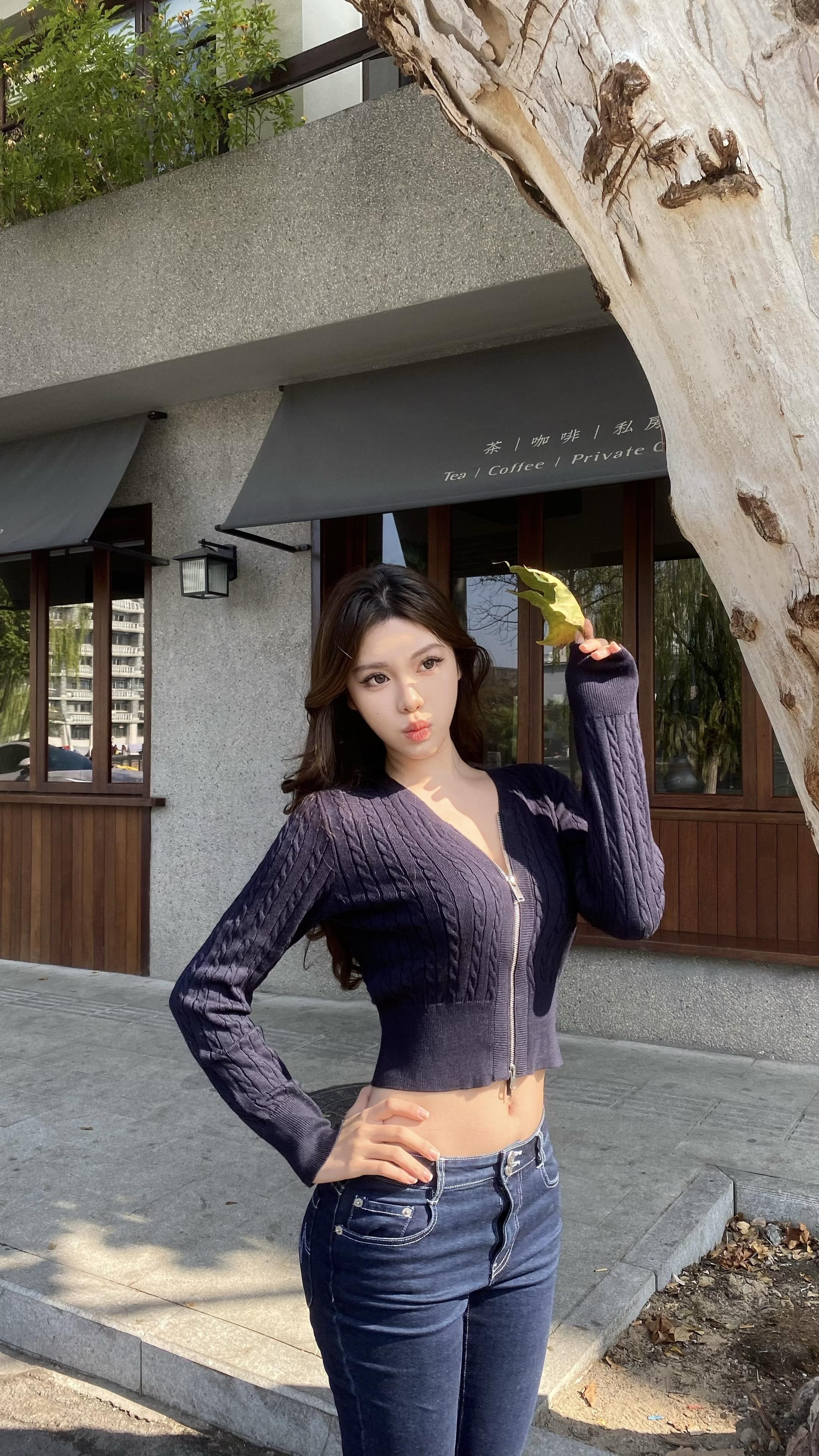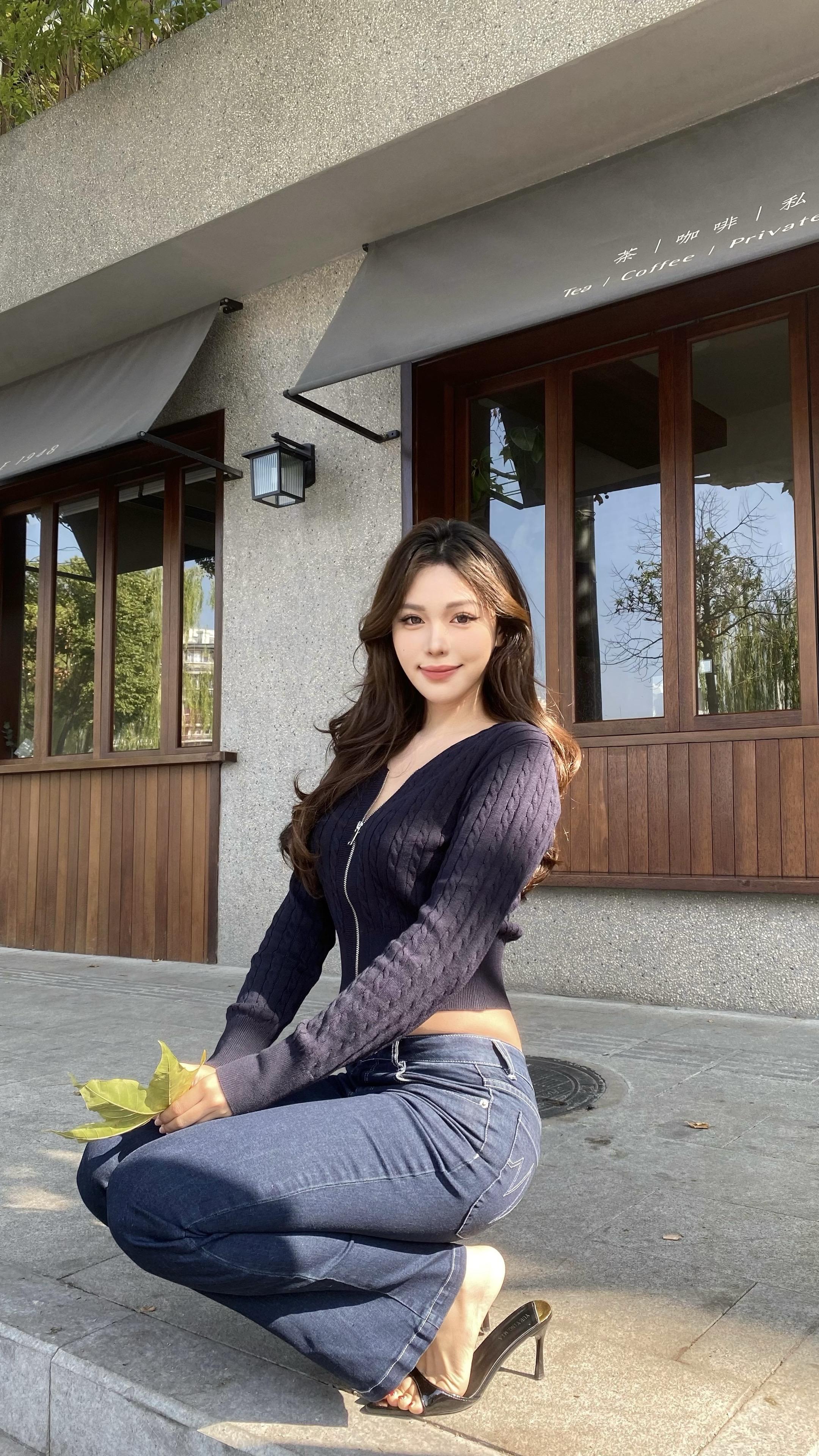优雅气质少女,坐在现代简约风格的咖啡馆里,散发着温柔与自信。