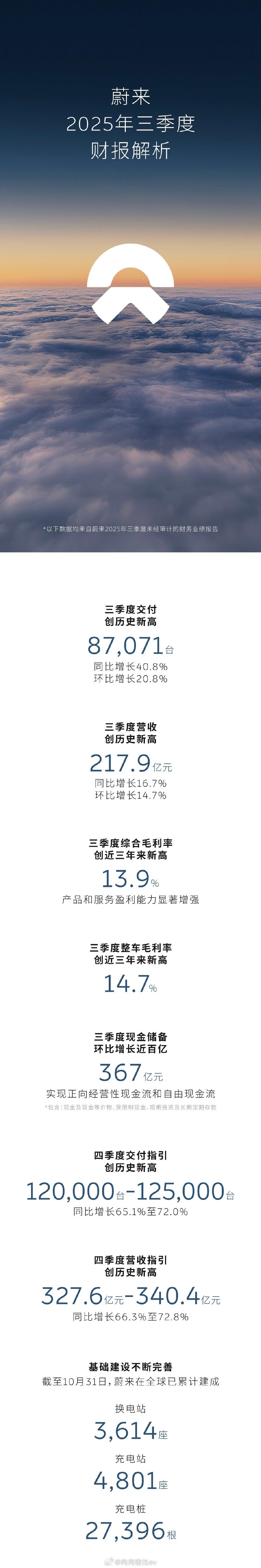 蔚来Q3财报:交付毛利双高藏隐忧,Q4交付指引缩水3万台该咋看? 蔚来发布Q3财报 • Q3交付新车87071台,环比增长20% • 营收217.9亿蔚来三季度营收创历史新高 • 综合毛利率13.9%,整车毛利率14.7% • 现金储备大幅度增长367亿 • 研发费用23.906亿 • Q4交付指引120000-125000台 很多人看了蔚来Q3财报,第一反应是“交付、营收、毛利都创新高,这不是挺好的吗?” 可再一看Q4交付指引从15万台变成12万-12.5万台,心里就犯嘀咕了:蔚来到底是“真回暖”还是“虚晃一枪”? 先看亮眼数据:Q3是真的“回血”了 • 交付端:8.7万台环比涨20%,核心功臣是乐道L90——这款车首月交付就破10575台,还是新势力里唯一首月交付过万的纯电SUV,还带动L60订单量涨了近30%; • 营收端:217.9亿创历史新高,完全靠L90、新ES8这些高毛利车型放量,比降价冲量的品牌靠谱得多; • 毛利端:整车毛利率14.7%,在高端市场竞争白热化的背景下,这个数据含金量十足; • 现金端:367亿现金储备+23.9亿研发投入,既留足了过冬底气,也保障了技术迭代。 再看隐忧:Q4交付指引“缩水”3万台,背后有门道 之前Q2说要冲15万台,现在直接降到12万档,这3万台的预期差不是瞎调的: • 一方面是产能磨合,L90虽然卖得火,但稳定量产还需要时间,车企不会为了短期目标强行扩产; • 另一方面是理性预期管理,Q2给15万台目标时,市场对L90反馈还不明确,现在根据实际订单和产能调整,反而更务实,只是容易让大家信心波动。 明星营销热闹,但得警惕“热度空转” 最近蔚来请了不少明星站台,确实赚了眼球。但买高端新能源车的用户,核心还是看换电、续航和智能化。好在L90本身有口碑——成都车展首批交付车主里,大部分是燃油车、插混车老车主,这种跨品类转化比明星站台更有说服力。 换电护城河虽深,成本压力也不小 全球3614座换电站、4801座充电站、27396根充电桩,规模没对手。但换电站建设、运营和电池折旧都是持续烧钱的,367亿现金储备看着多,既要扩换电网络,又要搞研发、推新车,压力其实不小。 蔚来Q3的“喜”和“忧”都很真实:亮眼业绩证明高端化路线走通了,但交付指引下调、运营成本高企,也暴露了规模化扩张的短板。 现在新能源市场里,高端有BBA电动化车型施压,中端有比亚迪、理想夹击,蔚来想继续增长,得稳住L90热度,还要优化产能和成本控制。蔚来 蔚来ES6 蔚来市值 你觉得蔚来这波财报是“真回血”还是“昙花一现”?评论区聊聊~