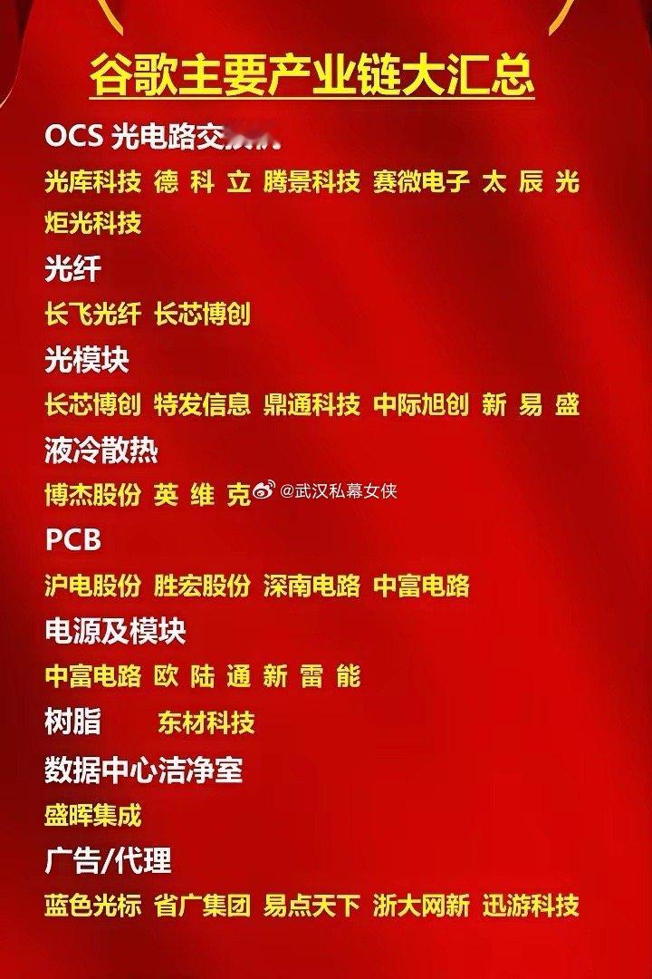 谷歌主要产业链大汇总。·OCS光电路交换机。·光库科技、德科立腾、景科技、赛微电子、太辰光、炬光科技。·光纤。·长飞光纤、长芯博创。·光模块。·长芯博创、特发信息、鼎通科技、中际旭创新、易盛。·液冷散热。·博杰股份、英维克。·沪电股份、胜宏股份、深南电路、中富电路。·电源及模块。·中富电路、欧陆通、新雷能。·树脂。·东材科技。·数据中心洁净室。·盛晖集成。·广告/代理。·蓝色光标、省广集团、易点天下、浙大网、新迅游科技。