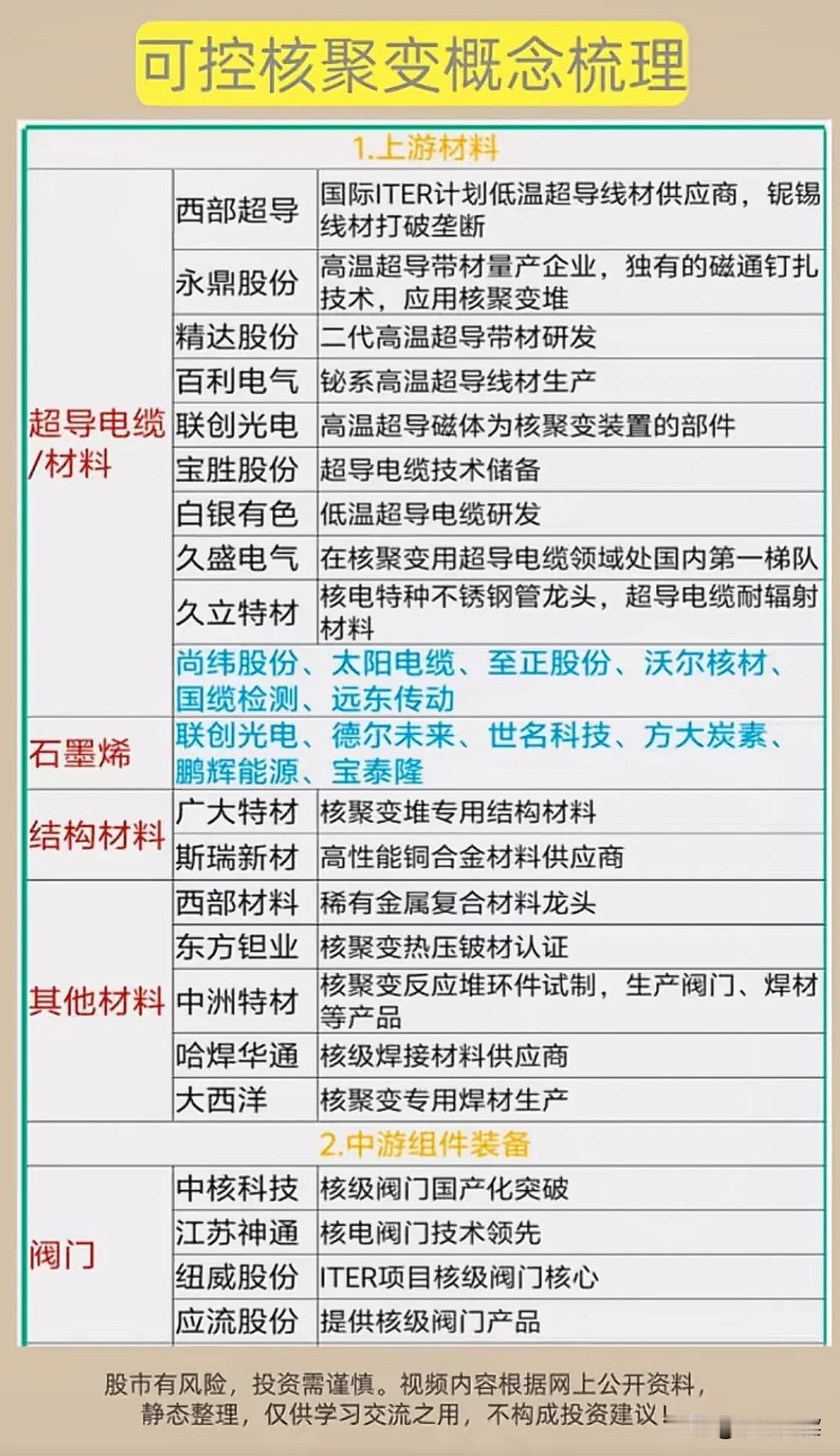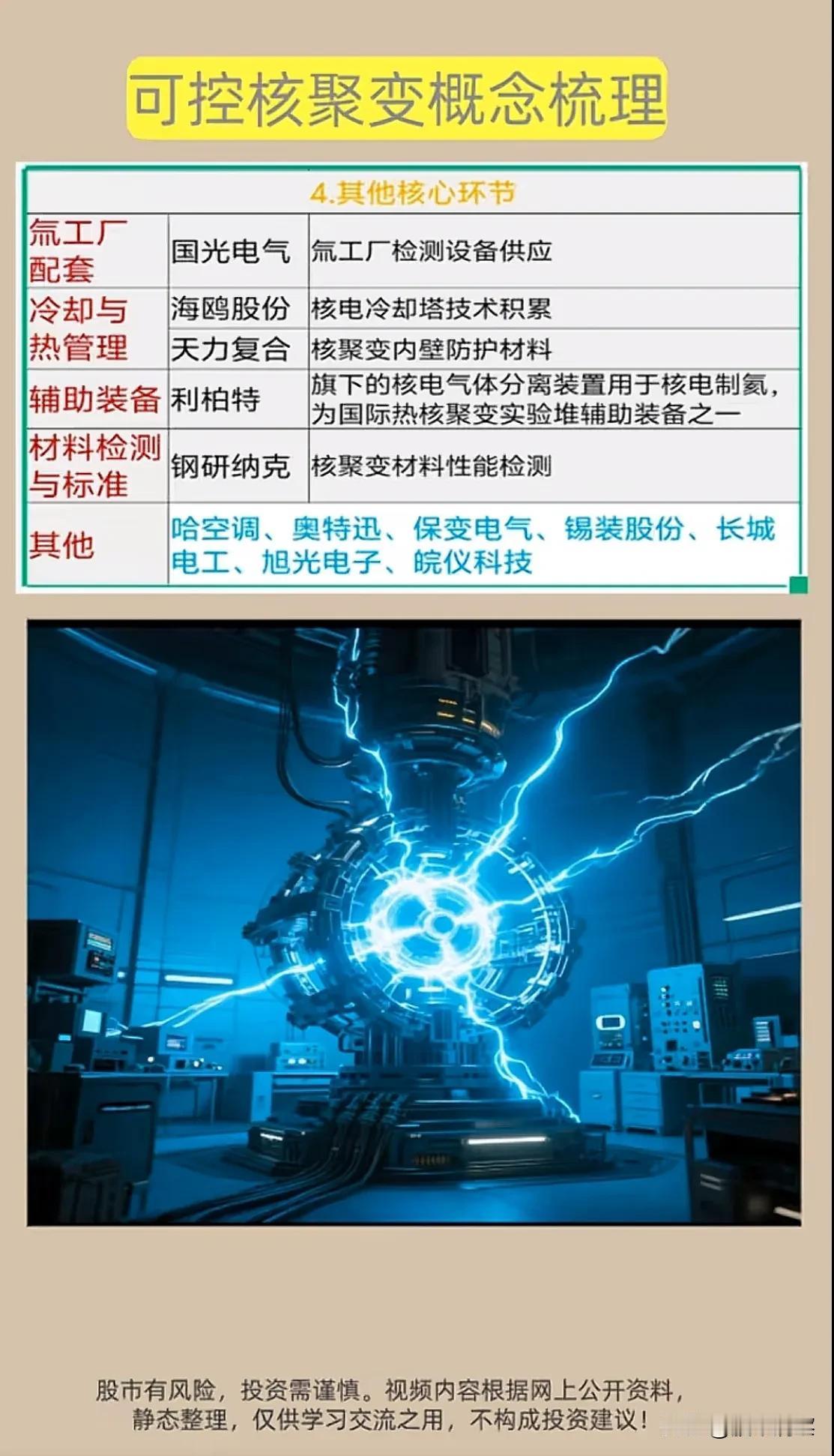 可控核聚变产业链全景解析与投资逻辑展望 可控核聚变作为未来能源的重要方向,近年来在技术研发与产业配套上取得积极进展,其产业链覆盖上游材料、中游装备及关键配套环节,已形成较为清晰的产业梯队。 从基本面看,产业链上游以超导材料、特种结构材料、焊接与防护材料为核心,国内多家企业在超导电缆、耐辐射合金、核级焊接等领域实现技术突破,部分产品已应用于国际热核聚变实验堆(ITER)等重大项目,具备较强的国产替代能力。中游则聚焦于核级阀门、冷却系统、内壁防护、检测设备等关键组件,相关企业在核电领域积累深厚,具备向聚变堆延伸的技术基础。 估值面上,由于核聚变仍处于研发与示范阶段,相关公司业务多以传统核电、特材、超导为主,聚变业务收入占比极低,估值多依托主题预期,尚未形成稳定盈利模型,需警惕估值泡沫。 技术面显示,板块整体仍处于概念期,股价受技术进展、政策风向与市场情绪影响较大,波动性较高,尚未形成明确的趋势性行情。 市场情绪与热度方面,随着“碳中和”目标推进与聚变技术突破频传,资本关注度逐步提升,但整体仍属小众题材,热度集中于事件驱动型机会。 就发展潜力而言,可控核聚变代表能源的终极方向,技术一旦实现商业化将重塑能源格局。我国在超导材料、组件设计与工程经验方面逐步积累,中长期具备参与全球竞争的潜力。 未来走势预计将随技术迭代与政策扶持呈现波段上行特征,但中短期仍以主题性机会为主。投资者应理性看待其长期价值与阶段性风险,关注技术突破与产业协同进展。 中国聚变能源 可控核聚变 核聚变产业 中国核聚变 超聚变技术 可控聚变装置 中国聚变 核聚变计划 股票交流 股票知识