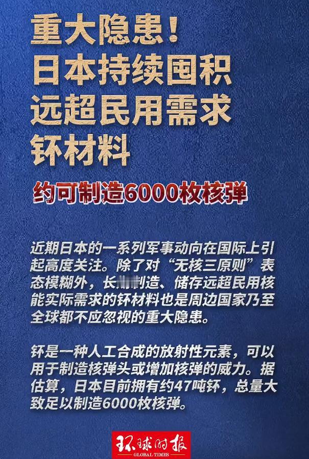 重大隐患!日本持续囤积远超民用需求钚材料约可制造6000枚核弹 近期日本的一系列军事动向在国际上引起高度关注。除了对“无核三原则”表态模糊外,长期制造、储存远超民用核能实际需求的钚材料也是周边国家乃至全球都不应忽视的重大隐患。 47吨分离钚堆在仓库里,相当于6000枚核弹的原料,而他们自称这些“和平利用”的材料,连本国核电站都用不上。 福岛核事故后日本只剩9台反应堆运行,全烧铀燃料,去年进口的8吨钚里,真正送进反应堆的还不到三分之一。 更离谱的是,他们一边说“没有处理计划”,一边让青森县的后处理厂开足马力,每年从核废料里再提炼8吨钚,这哪是民用储备,分明是在给核武库打底子。 钚这玩意儿天生两面派:纯度93%以上就是武器级,6公斤就能造一颗核弹;低于这个纯度,勉强能当核电站燃料。 日本存的47吨里,光武器级就有10吨,剩下的37吨民用级,通过他们掌握的后处理技术,三个月就能提纯成武器材料。 全球44个用MOX燃料(含钚)的反应堆里,日本占18个,但这些反应堆每年最多消耗2.6吨钚。现在的库存够他们用39年,还不算每年新进口的8吨。明眼人都看得出,这不是囤燃料,是囤“核选项”。 再说日本的技术底气。作为《不扩散核武器条约》里唯一掌握核燃料后处理技术的无核国家,他们早把这条路走通了。 从英法进口的钚藏在境外仓库,国内六所村的工厂能把核废料里的钚“榨”出来,超级计算机“富岳”能模拟核爆,H-3火箭改改就是洲际导弹。 2011年福岛事故时,他们连反应堆延寿这种基本安全都敢糊弄,现在却把核材料管得“滴水不漏”? 去年黑帮头目在美国认罪,供出日本黑社会早就在倒腾武器级钚,这事儿撕开了日本核监管的遮羞布,连有组织犯罪都能染指的材料,谈什么安全? 更危险的是政治信号。自民党把“无核三原则”从“国策”降级成“参考”,首相在国会回避“是否坚持无核”的提问,防卫预算连续五年破纪录。 他们一边拿“唯一核爆受害国”的身份卖惨,一边给美军核潜艇开放港口,甚至讨论“核共享”。这种矛盾在核污水排海时就暴露过:嘴上说“为全球环保”,实际把130万吨放射性废水倒进太平洋。 现在轮到钚储备,同样的逻辑在重演——用“民用”包装军事野心,拿“受害国”身份抵消国际质疑。 最让人不安的是连锁反应。韩国43%的民众支持自研核武器,朝鲜重启核设施,台湾地区暗戳戳搞“全民防卫”。这些动向背后,都是日本核模糊战略引发的恐慌。 想想看,一个二战时搞过731部队、至今不彻底反省侵略历史的国家,手里攥着够武装半个地球的核材料,监管体系漏洞百出,还在不断突破战后秩序。这不是隐患,是悬在东亚头顶的达摩克利斯之剑。 国际原子能机构的数据显示,日本境外储存的20吨钚,核查频率从季度变成了半年,去年还查出0.8吨的账实不符。 当一个国家把“和平利用”变成“战略囤积”,把“无核承诺”当成橡皮泥,全球核不扩散体系就岌岌可危。 毕竟,NPT给日本的红利够多了:几十年低价引进核技术,靠“反核”人设拿国际话语权,现在却想掀桌子。 这不是简单的军事储备问题,而是战后国际秩序能否存续的根本挑战。毕竟,纵容一次“例外”,就会有无数个“效仿者”,最终受害的,是所有普通人的和平期待。