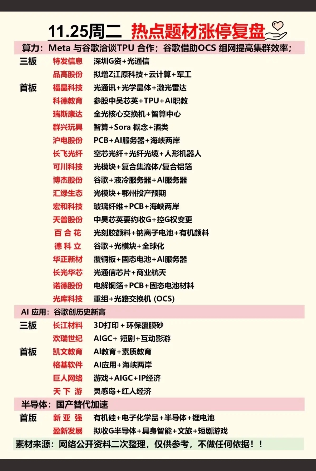 11.25周二 热点题材+涨停复盘!Meta与谷歌洽谈TPU合作;谷歌借助oCS组网提高集群效率;谷歌ai应用商业航天,流感医药,锂电池相关、