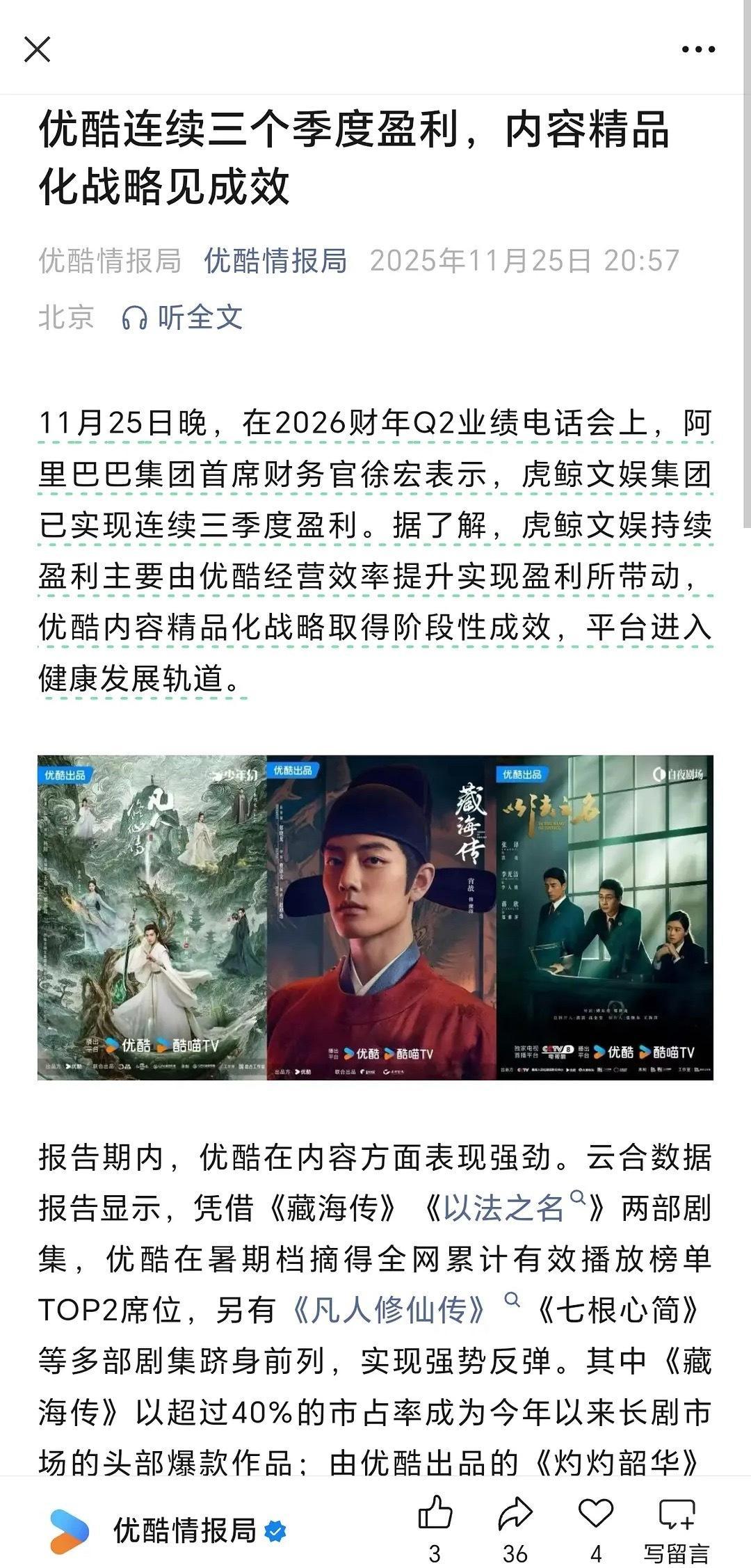优酷成为今年最大赢家!连续三季度实现盈利,其中最赚钱的是肖战《藏海传》爱奇艺第三季度由盈转巨亏,在电影部分强劲增长的情况下还亏几亿,说明但凡有一部剧实现盈利也不会亏这么多!