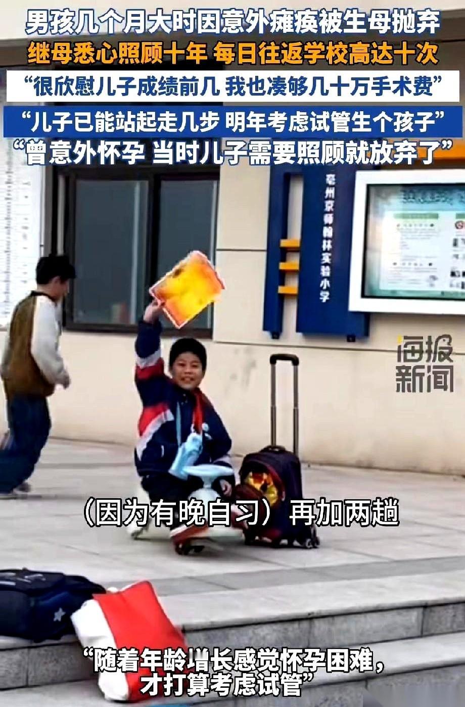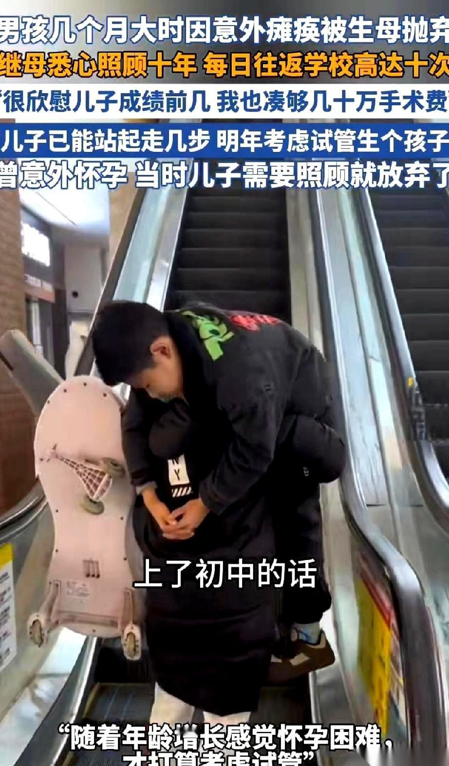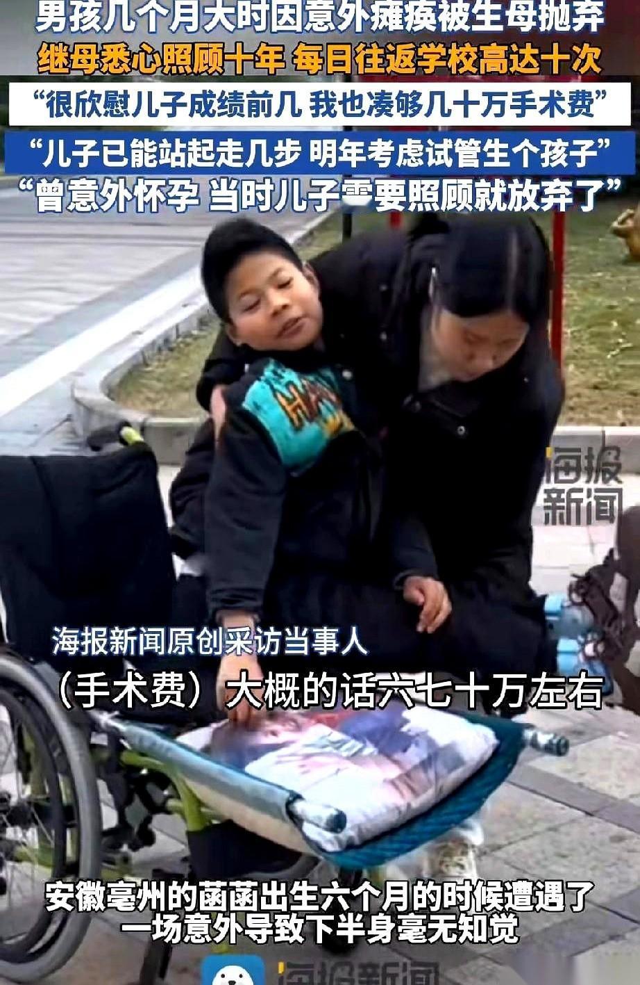 记者问她:“你不想有自己的孩子吗?” 她听完,眼泪一下就涌出来了。 说,怀过。但为了照顾家里两个孩子,没要。 我看到这儿,心脏就像被一只手攥住了。 二十多岁,一个女人最好的年纪,她嫁了。嫁给一个男人,也嫁给了一个烂摊子——男人带着一个女儿,还有一个六个月大就瘫痪在床、被亲妈扔下的儿子。 从此,她的世界就变了。 每天抱着那个半大不小的男孩去上学,风雨无阻。中午送饭,下午课间还得跑去学校,带他上厕所。晚上再抱回家。 日复一日,年复一年。 她没有自己的工作,就在家接点零碎手工活,一块钱一块钱地挣。男人在外打工。 几十万的手术费,是她拉下脸回娘家借的。 我真的无法想象。 当她放弃自己腹中那个小生命的时候,她心里在想什么。 那该有多疼啊。 很多人都在夸她“伟大”,“胜似亲娘”。 我觉得这些词,太空了,太轻了。 这根本不是一个“好人好事”的故事。 这是一个女人,用放弃自己一部分人生作为代价,去硬生生换回另一个孩子人生的故事。 这里面有爱,有善良,但更有你看不到的、咬碎了牙的牺牲和妥协。 “后妈”,这个词在她身上,简直是一种侮辱。 她就是一个普普通通的女人,用最笨拙、最真实、也最惨烈的方式,告诉我们爱到底可以是什么样子。 还好,孩子手术后能站起来了。 她说,现在终于可以考虑,要自己的孩子了。 真好。 老天爷,你可得看顾着这样的人啊。