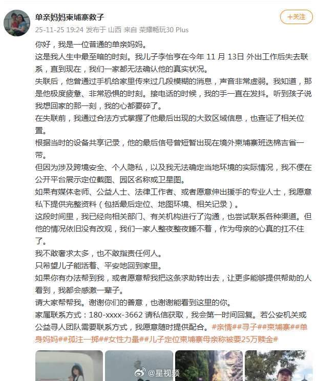 11月25日晚,演员 发布一条求助信息,称与其一起长大的表弟在11月13日外出工作后失去联系,其家人在通过各种方式在找人,并附带了弟弟母亲 发布的详细求助信息。据 发布的信息显示,其儿子李怡亨最后信号曾短暂出现在境外柬埔寨班迭棉吉省一带,“失联后,他曾通过手机给家里传来过几段模糊的消息,声音非常虚弱。”“直到现在,我们一家都无法确认他的真实状况。”