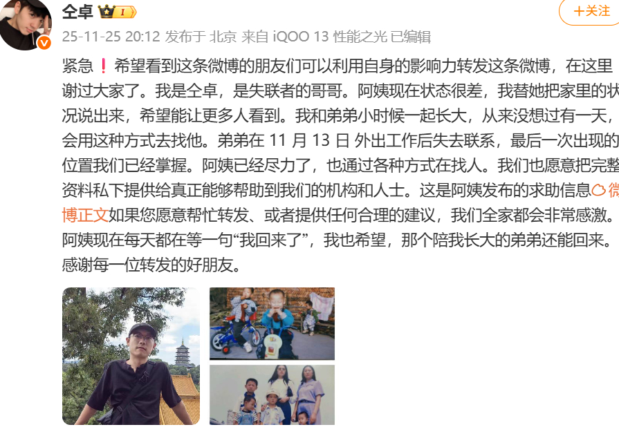 11月25日晚,演员发布一条求助信息,称与其一起长大的表弟在11月13日外出工