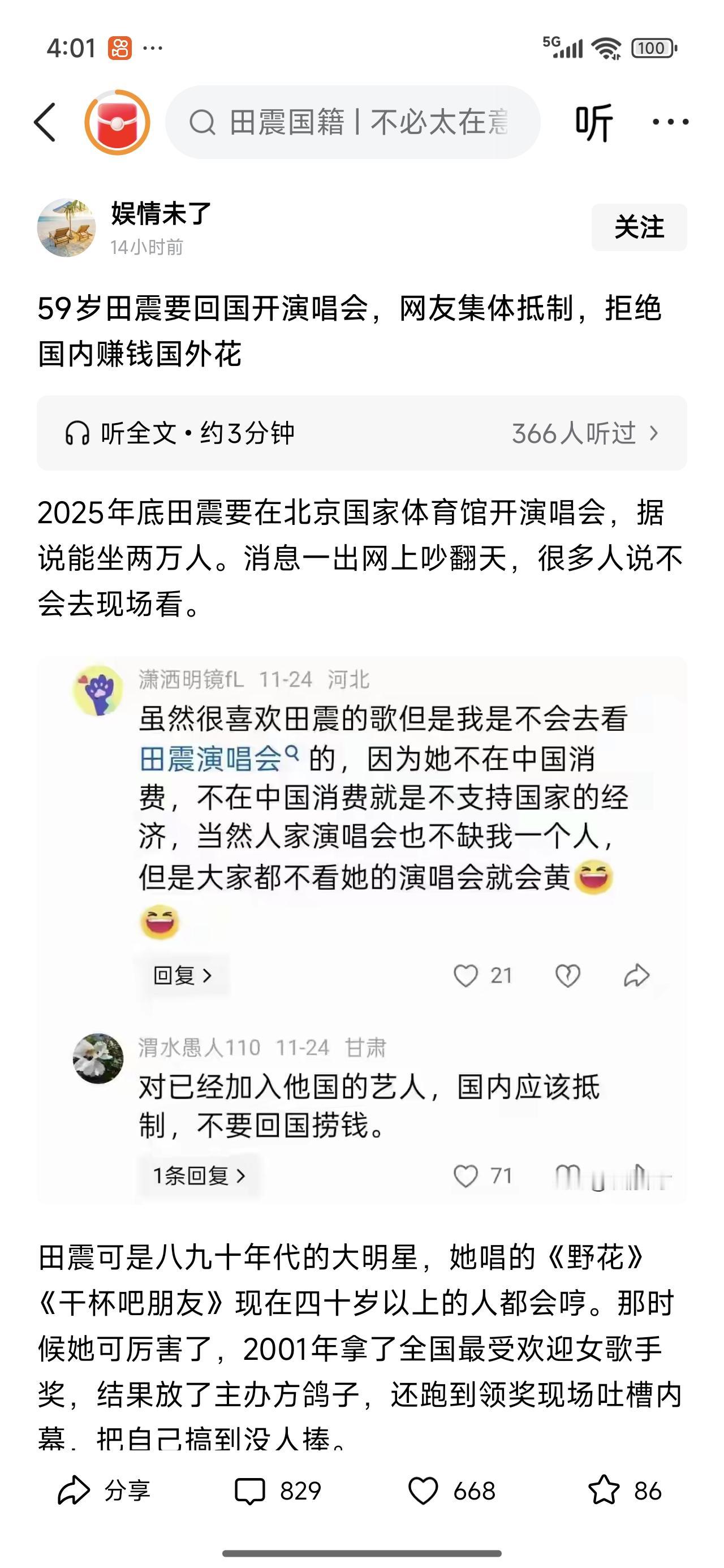 田震想在25年跨年开演唱会。网友集体抵制。禁止国内挣钱国外花。 老牌明星,好多年