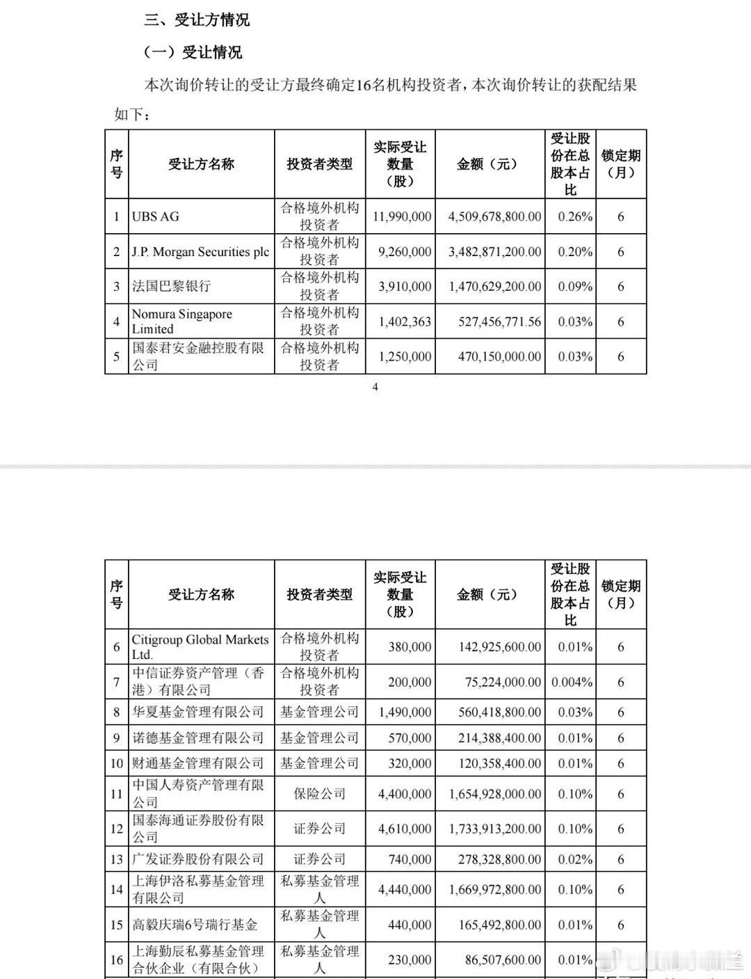16家机构172亿受让宁德时代二股东减持!宁德时代今晚公告,二股东黄世霖询价转让的45632363股股票,16家机构投资者受让确定。此次询价转让价格376.12元/股,总共受让资金约171.63亿元,限售期6个月。受让方包括瑞银集团,摩根大通,法国巴黎银行,野村新加坡,国泰君安金控,花旗环球,中信证券资产(香港)等7家QFII,华夏,诺德,财通等3家基金公司,1家保险公司,两家证券公司,3家私募基金。其中,瑞银集团受让资金超45亿元,摩根大通受让资金近35亿元,7家QFII受让资金超过120亿元。目前宁德时代港股股价468.20港元,A股股价372.36元(低于询价转让价),汇率换算后,港股价格较A股价格高约15%。港股价格较A股价格溢价,可能是吸引QFII大手笔受让的主要原因。