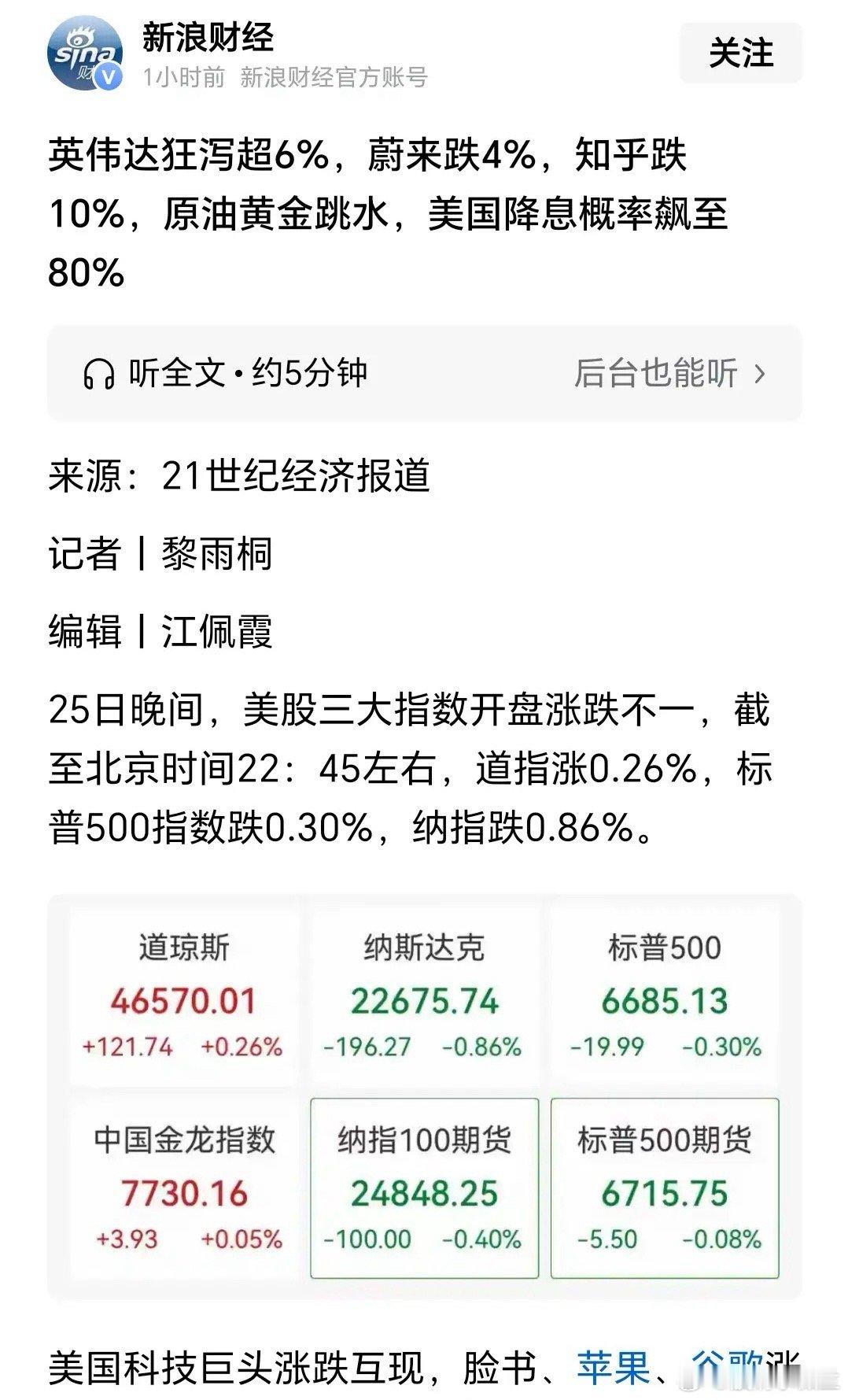 英伟达大跌超6%,蔚来大跌4%,知乎大跌10%,原油黄金跳水…美股又是超级低开,尾盘还能拉上去吗?最近的美股震荡幅度也是可怕,相比之下,确实还是A股要稳定很多。