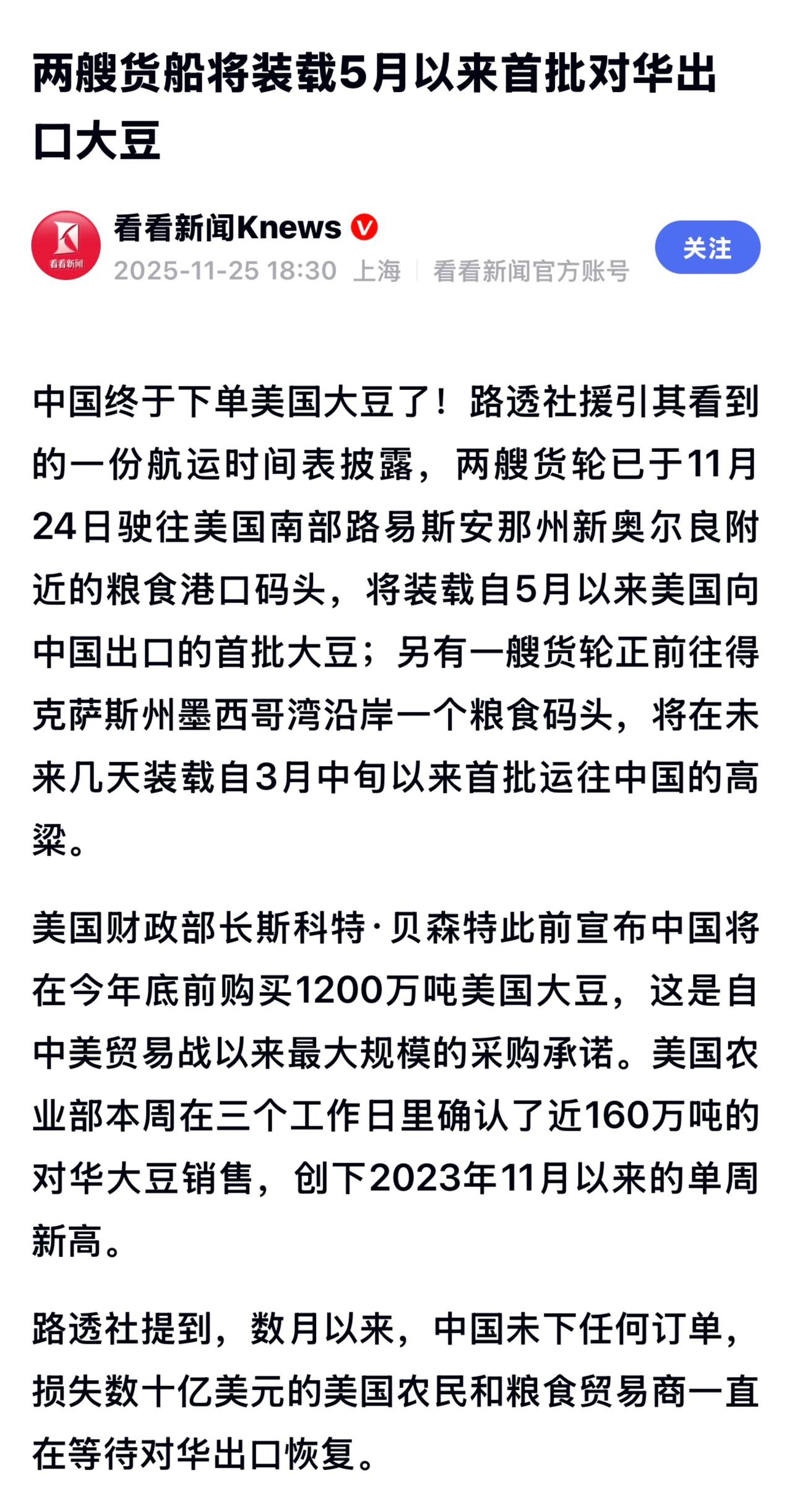 贝森特11月25日说,中国购买美国大豆的计划“完全按计划进行”。 他说,中美两国永远是天然的竞争对手,但两国关系目前处于良好状态。