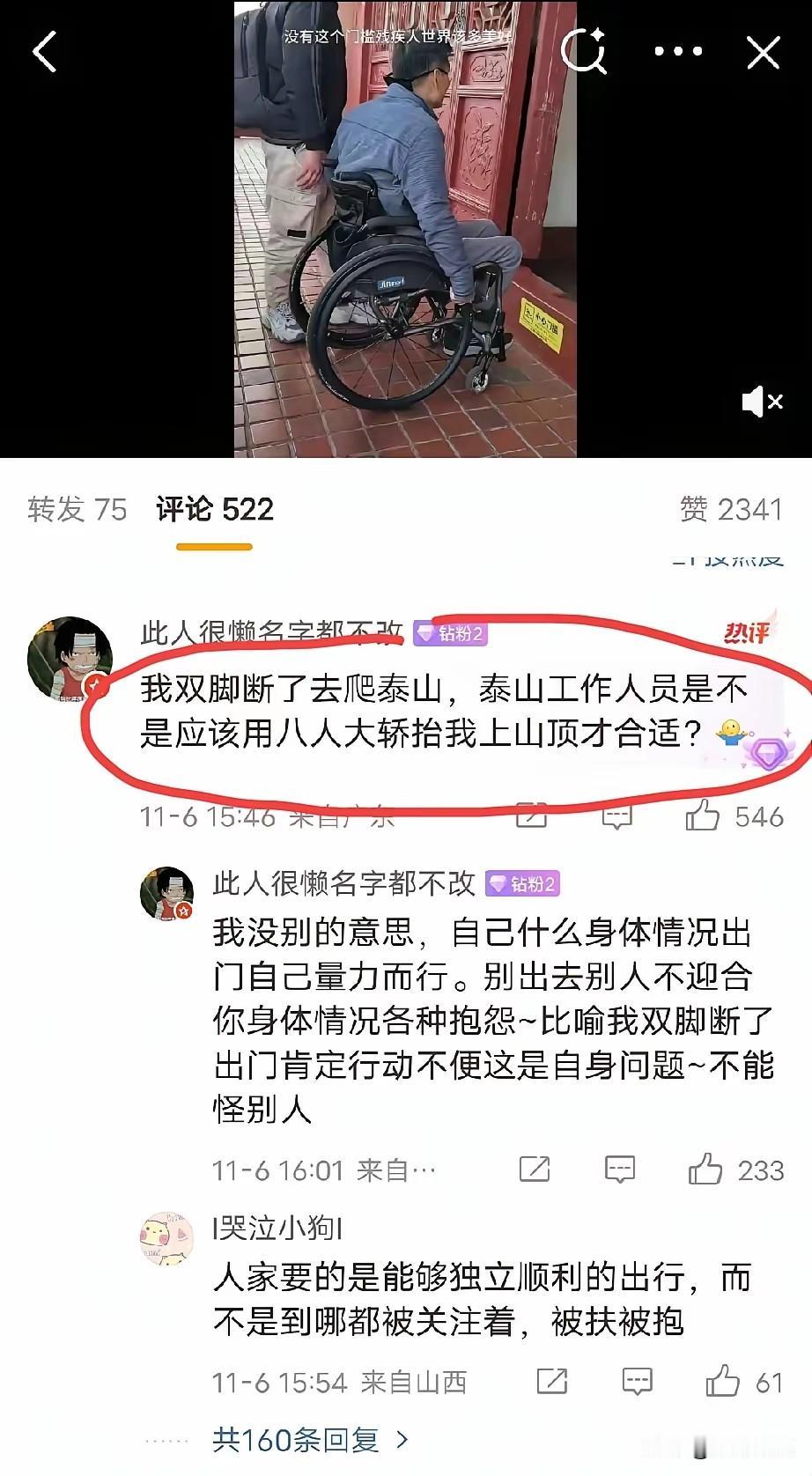 男子身患残疾, 双腿不能正常走路, 需要坐轮椅出行, 他来到了一处景区, 想要进人家的屋里面参观, 奈何门口有一个门槛, 古建筑都有一个门槛, 工作人员看见后也上前帮忙, 家属和工作人员将他抬了进去, 事后他居然吐槽要是没有门槛,残疾人的世界该多美好! 本来想引导网友网暴景区, 没想到网友根本不买, 还吐槽内涵他, 如果双腿残疾去爬泰山是不是让工作人员八抬大轿给你抬上山顶, 本来还想同情这位残疾大哥, 如果看到他的言论就知道他是个自私的人,这样的人不值得同情! 大家对于残疾人游览景区不方便吐槽景区怎么看? 每人推荐一个旅行目的地 残疾人 残疾人状况 残疾人出行 残疾人实拍