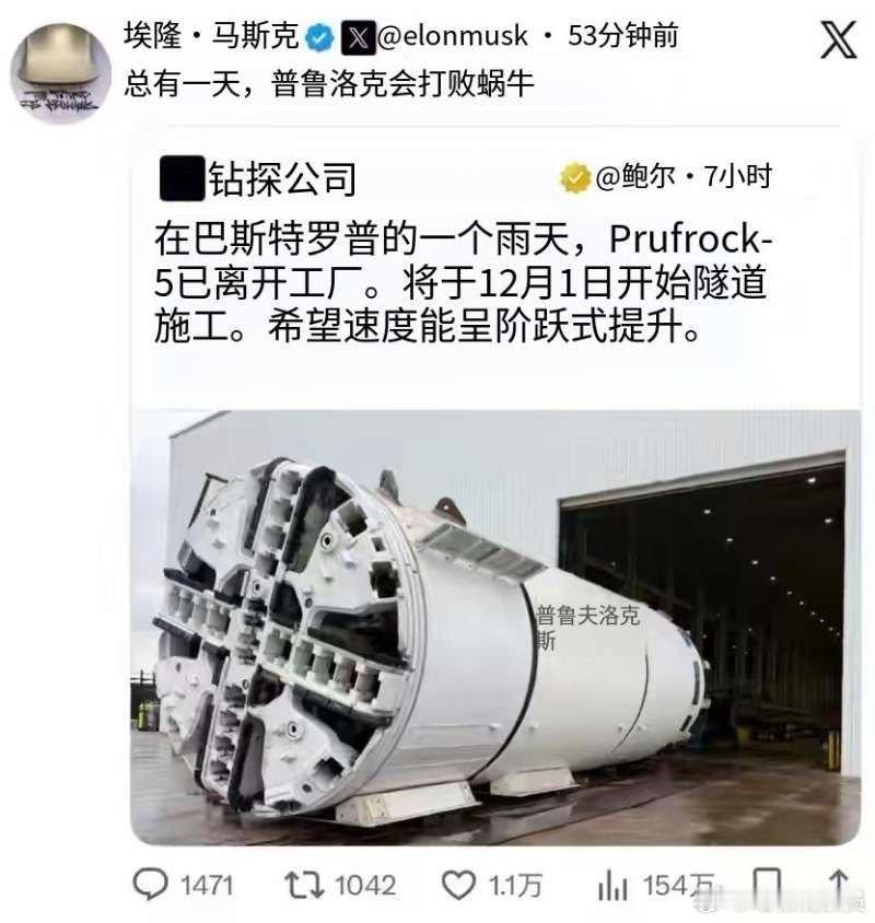 马斯克发帖,展示自家公司的新一代隧道掘进机Prufrock-5,这台机器被称为地下交通革命的核心,支持全自动掘进、无人作业、多层立体隧道。其实马斯克也一直关注着这种设备,目前就隧道掘进技术而言,如果论机械成熟度和工程适用性,中国的盾构机仍是领先的。但若 Prufrock5 能实现其设计目标(平均每周4英里),那么在未来快速施工场景中会是有力的竞争者。