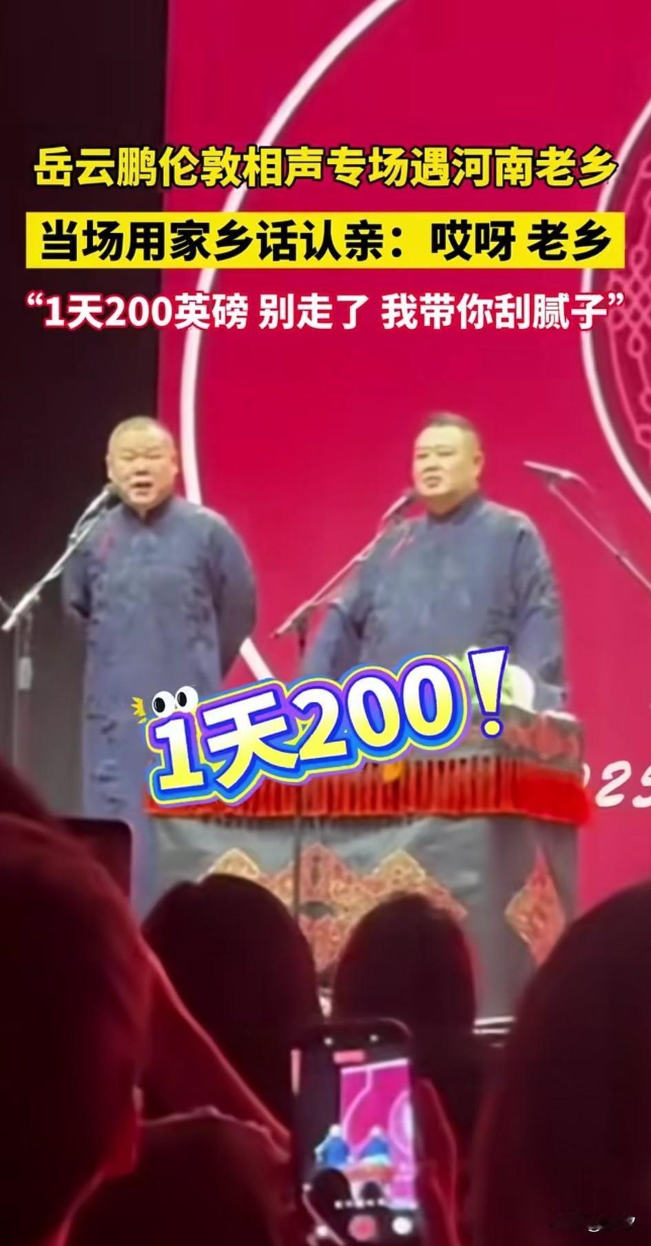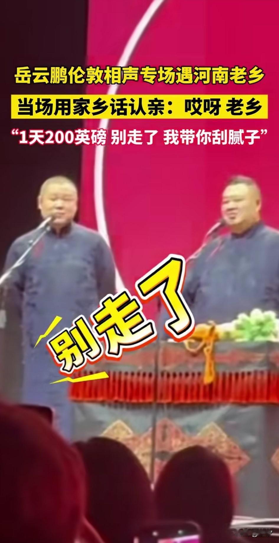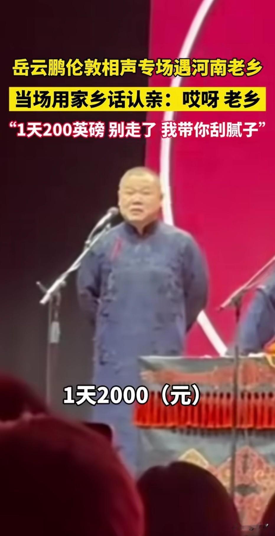 岳云鹏伦敦专场遇到河南老乡, 问河南老乡是哪里人? 老乡用河南话告诉他来自濮阳, 这可让岳云鹏开心坏了, 拿着话筒问老乡来伦敦干什么? 河南老乡告诉他来这里干活, 自己在干刮腻子的活, 岳云鹏问他收入怎么样? 老乡表示刮腻子一天200, 然后又强调是英镑, 这让岳云鹏惊叹不已, 换算了一下200英镑就是2000人民币, 他表示一天2000元, 觉得收入太高了, 河南老乡呼喊岳云鹏别走了, 可以带着他一起在伦敦刮腻, 这让现场的观众哈哈大笑, 还别说一天2000人民币收入确实可以, 如果能够干10年, 完全可以回国内躺平养老, 大家对于岳云鹏被老乡邀请在伦敦刮腻子怎么看? 岳云鹏 岳云鹏巡演 岳云鹏演技 岳云鹏出场费 岳云鹏收入