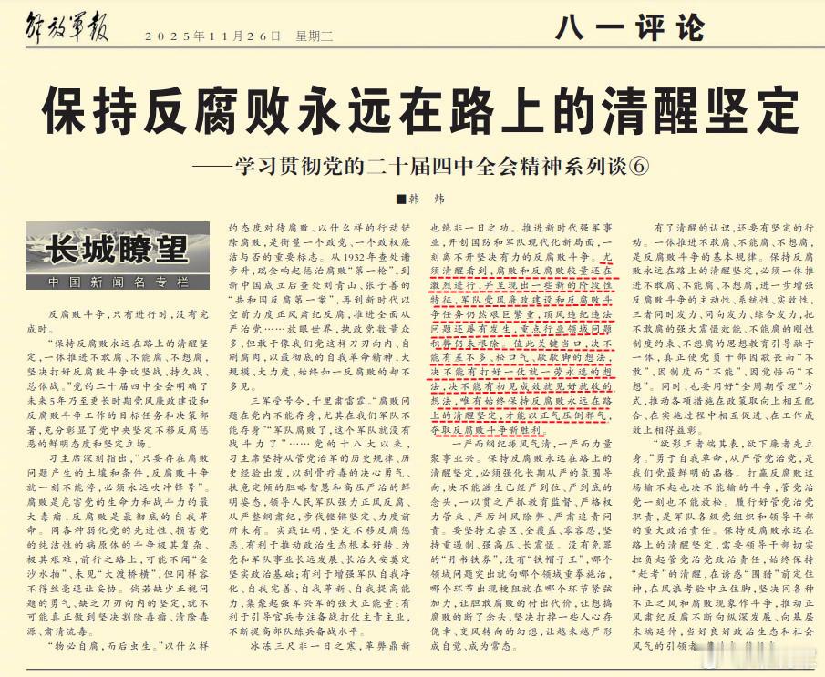 今天《解放军报》文章中写到:尤须清醒看到,腐败和反腐败较量还在激烈进行,并呈现出一些新的阶段性特征,军队党风廉政建设和反腐败斗争任务仍然艰巨繁重,顶风违纪违法问题还屡有发生,重点行业领域问题积弊仍未根除。值此关键当口,决不能有差不多、松口气、歇歇脚的想法,决不能有打好一仗就一劳永逸的想法,决不能有初见成效就见好就收的想法,唯有始终保持反腐败永远在路上的清醒坚定,才能以正气压倒邪气,夺取反腐败斗争新胜利。