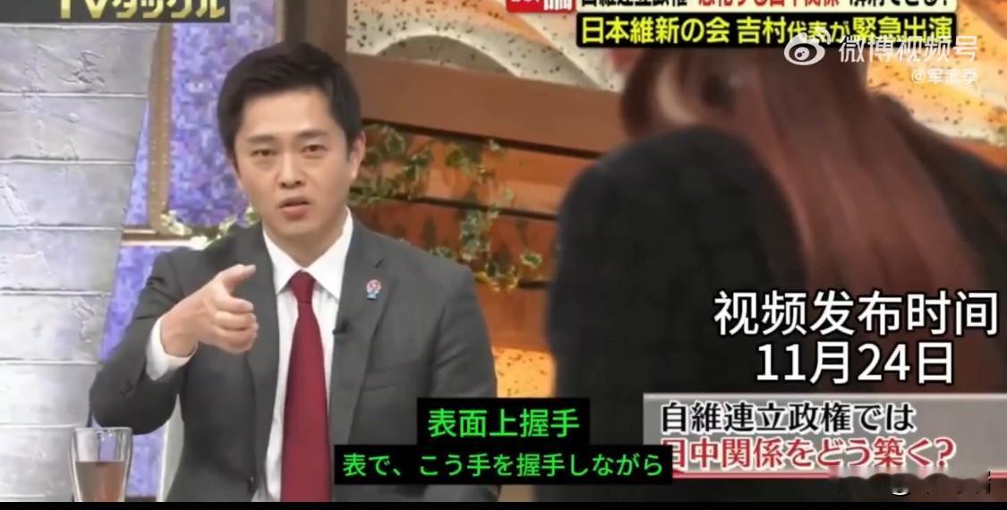 日本维新会代表吉村洋文建议高市早苗不要撤回对台湾问题的发言,并形容日本与中国的关系构建需要握手的同时用脚踢。 某些日本政客不要太天真了,还妄想对中国说一套做一套,如果你们继续干涉中国内政、侵犯中国核心利益,你们连握手的机会都不会有了!