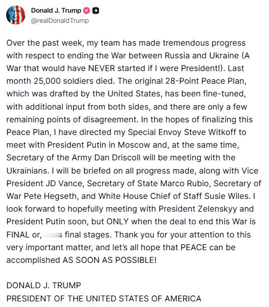美俄乌三方总统会面要来了。阿川:过去一周,我的团队在结束俄乌战争方面取得了巨大进展。最初由美国起草的28点和平计划,在双方的进一步参与下,已经过完善,目前仅剩少数分歧。为了最终敲定这项和平计划,我已经指示我的特使史蒂夫·威特科夫前往莫斯科与普京总统会面,同时,陆军部长丹·德里斯科尔也将与乌克兰方面会面。我期待着尽快与泽连斯基总统和普京总统会面,但前提是结束这场战争的协议已经最终达成或进入最后阶段。