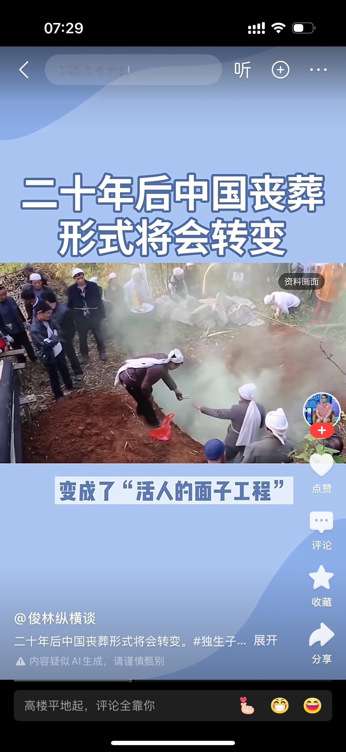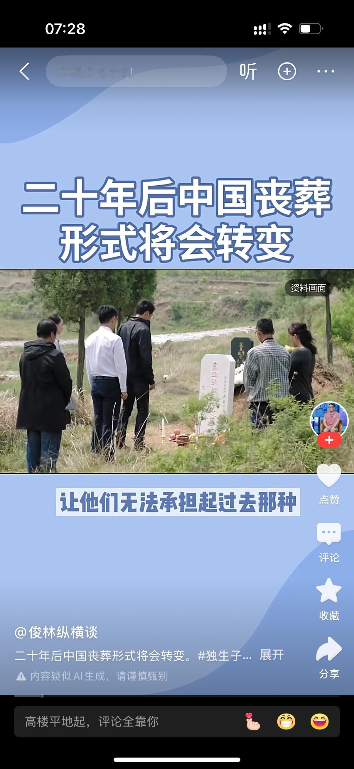 二十年后农村人的丧葬形式将会彻底的转变。其实现在已经有了一些小小的变化。我的一个发小,农村人,他父亲不久前去世了。没有土葬,没有敲锣打鼓,没有三天三夜的流水席,直接找殡葬公司一条龙,火化取骨灰,完事。本来一个星期的事情,1天就办完了。人都死了,还吹拉弹唱,该摒弃了。