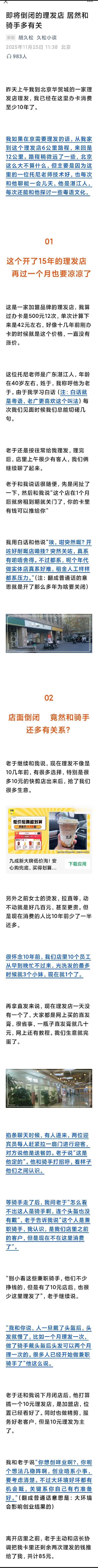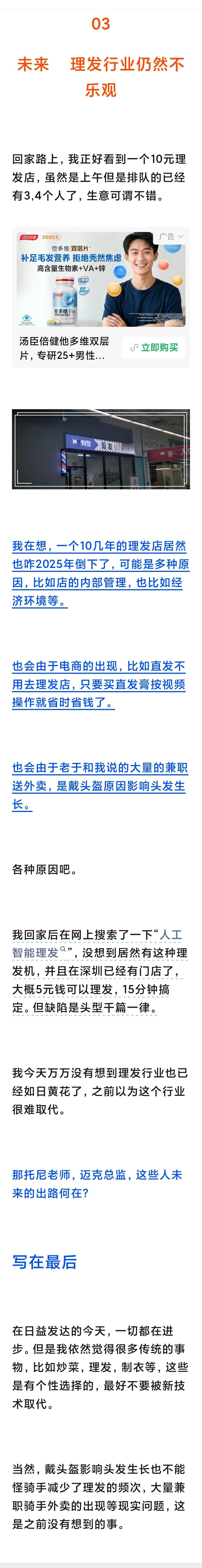 即将倒闭的理发店 居然和骑手多有关理发变便宜了,这贴说了几个现象。10元理发店,这还怎么挣钱?之前女士的烫发,拉直等,动不动就是好几百元,甚至更贵。但是现在消费的人比10年前少了一半还多。大家都是网上买的直发膏,很省事,一瓶子直发膏就几十元,网上还有教程。我们生意就完蛋了。别小看这些兼职骑手,他们不少挣钱的,但是有了10元店后,也很少这里理发了。总觉得不对劲,服务越搞越便宜,还能这样发展?确实不少领域搞成低价了。