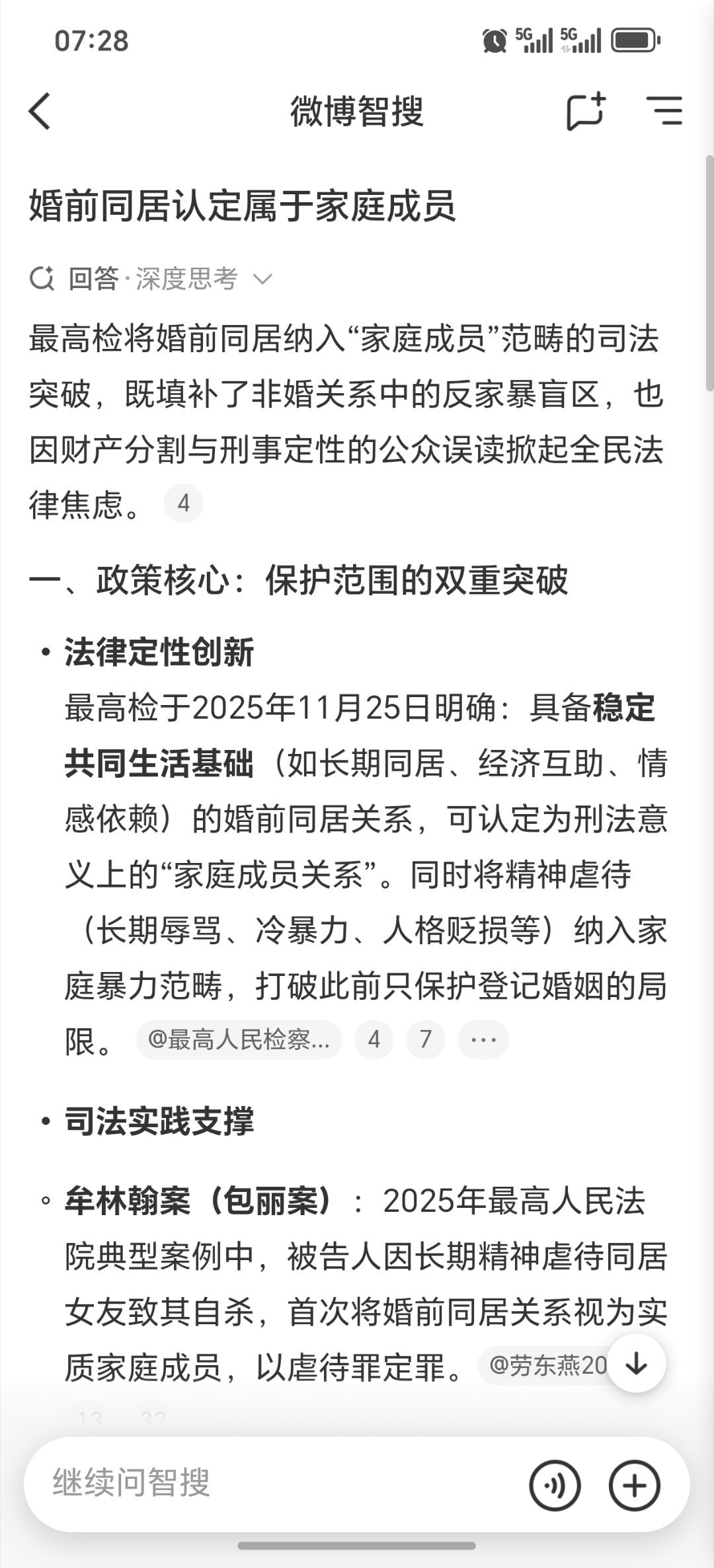 最高检:具备稳定共同生活基础(如长期同居、经济互助、情感依赖)的婚前同居关系,可认定为刑法意义上的“家庭成员关系”。同时将精神虐待(长期辱骂、冷暴力、人格贬损等)纳入家庭暴力范畴,打破此前只保护登记婚姻的局限。 @