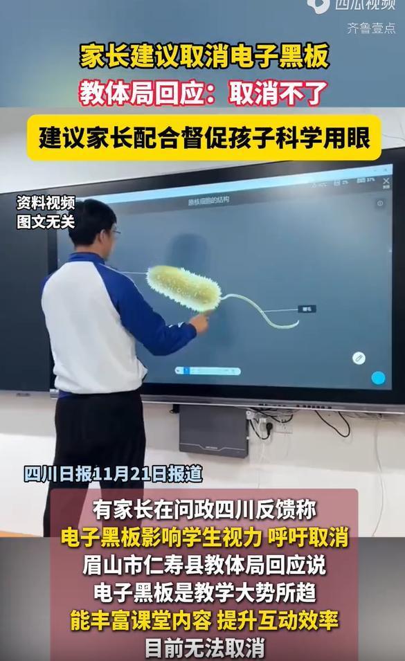 《黑板该怎么用?》 关于电子黑板要不要取消,这事其实不用吵来吵去,说白了就是怎么用、用在哪儿更合适的问题。电子屏幕不是洪水猛兽,很多三维动画、动态课件确实能帮学生把抽象知识看得更清楚,这一点不能否认。但把电子屏当成主力、整堂课都照着屏幕走,那就有点本末倒置了。 孩子的眼睛不是铁打的,长时间盯屏幕肯定受不了。最踏实、最有效的学习方式,还是老师板书、学生做笔记。手写一遍,脑子过一遍,比只盯着大屏幕强得多。真正的理解,往往就在那几笔写写画画里产生。 如果担心粉笔灰,也不是没办法。现在不是有电纸屏、无尘粉笔、白板笔这些选择嘛,该换的换一换就行了,没必要“一刀切”全靠电子设备。 说到底,教学工具是给老师和学生服务的,不是让人被迫适应的。合理搭配,让电子设备做辅助,让板书和笔记当主角,这才是对孩子视力和学习效果最负责的方式。学校多听听家长声音,家长也多理解教学需要,大家一起把事办好,比争谁对谁错重要得多。