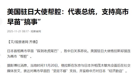 日本全网彻底炸了,美国驻日大使开完会直接对着媒体放话,声称自己代表总统和大使馆,全力支持高市早苗首相,这番赤裸裸的站队把日本直接架到了风口上,想下来都难。   这话一出口,不仅日本网友炸了,连自民党内部都乱成了一锅粥。这时候的高市早苗刚坐上首相宝座没一个月,本来就因为涉台的激进言论被中方连番痛批,经济上还吃着中国的反制套餐——海鲜出口拦在海关,汽车零部件订单被取消,渔民们天天堵在首相官邸门口抗议。   就在她焦头烂额的时候,格拉斯突然递来“美国撑腰”的橄榄枝,而且还扣上了“总统代表”的大帽子,这简直是把她往风口浪尖上推,想下来都没台阶。   格拉斯倒是斩钉截铁,不光表支持,还跟着日方一起骂中方,说中国的“经济胁迫”破坏地区稳定,甚至替日本渔民抱不平,说“他们好不容易拿到的中国订单被剥夺,我们绝不会坐视不管”。   可这份底气没撑过两天就碎了。11月22日,福克斯新闻播出了对特朗普的专访,当记者问到“是否会力挺盟友日本”时,特朗普的回答让全日本都傻了眼。   他却说:“很多人觉得盟友就是朋友,这是大错特错的,他们占美国的便宜比谁都多。”这话跟格拉斯“代表总统支持”的表态完全对不上号,而且熟悉特朗普的人都知道,他说“盟友不算朋友”从来不是随口说说——之前在北约峰会上,他就当众骂欧洲盟友“欠军费不还”,现在这话落到日本头上,分量完全不一样。   更让日本政坛慌神的是,高市早苗自己跟特朗普通话后的反应。就在格拉斯表态前一天,高市急匆匆地召开记者会,说“已与特朗普通话,确认了日美紧密的合作关系,他说我们是亲密朋友”,可一被追问特朗普有没有提涉台言论,她就立刻闭了嘴,只说“外交事项不便透露”。   当时大家还以为是她想藏着掖着,现在结合特朗普的采访才回过味来——要是特朗普真给了明确支持,以日本外务省的尿性,早把通话录音剪辑成宣传片全网放了,哪会这么吞吞吐吐。   这下日本政坛彻底乱了套。自民党资深议员麻生太郎私下里跟亲信抱怨:“格拉斯说代表总统,总统本人却说盟友不是朋友,到底谁的话算数?”   之前一直反对高市激进路线的石破茂派系,趁机抛出了“谨慎应对”的提案,说不能光听美国大使的,得等白宫的正式声明。   连高市自己的办公室都乱了,负责美日关系的官员连夜飞往华盛顿,想求个准话,结果连白宫的大门都没进去,只收到国务院一句“大使的表态是其个人立场”的敷衍回复。   其实明眼人早就看出不对劲了。格拉斯虽然喊着“代表总统”,但从头到尾白宫都没发过正式声明,特朗普本人更是半个字没提过高市早苗。   反倒是美国国务院副发言人皮戈特在社交媒体上发了段模棱两可的话,既说“美日同盟坚定不移”,又没提支持高市,这种操作跟当年把乌克兰架在火上烤的套路如出一辙。   更耐人寻味的是,就在格拉斯表态的同时,美国批准了向日本出售精确制导炸弹的订单,日本也宣布向美国返销“爱国者”导弹,明摆着是借着“支持”的由头赚军火钱。   高市早苗现在的处境纯属骑虎难下。她本来是靠着“安倍路线继承人”的身份上位,刚上台就抛出涉台言论想讨好右翼,结果惹恼了中国。   现在美国大使给了根“救命稻草”,她要是不抓,右翼会骂她“软弱”,首相位置坐不稳;可要是真顺着美国的话头硬扛,特朗普那边一撒手,日本就得独自面对中国的反制。   之前王毅外长已经明确表态,要求日方收回错误言论,中亚国家也都站出来支持中国的一个中国原则,高市要是再执迷不悟,别说经济损失,连地区影响力都得丢光。   最讽刺的是,特朗普心里打得比谁都精。他知道高市的激进言论能牵制中国,还能逼着日本增加军费、买美国的武器,这完全符合“美国优先”的路子。   但他又不想把美国拖进冲突,所以故意让大使放话,自己却含糊其辞,这样既能让日本当“马前卒”,又能在局势失控时摘干净。   日本政坛现在才反应过来,格拉斯的“全力支持”根本不是保护伞,而是把他们绑在美军亚太战略战车上的绳索,想下来都难。   现在全日本都在等白宫的准话,可特朗普的心思谁也猜不透。他前几天还说“中美合作利益更大”,转头就让大使给日本灌迷魂汤,这种上下不一的操作,本质上就是把日本当棋子。   高市早苗要是真看懂了,就该赶紧收回错误言论,别再被美国当枪使;要是还执迷不悟,等到美国把好处捞够撒手不管,日本就真的要重蹈乌克兰的覆辙了。毕竟在特朗普眼里,盟友从来都不是朋友,只是随时可以牺牲的筹码,这个道理,日本现在该懂了。