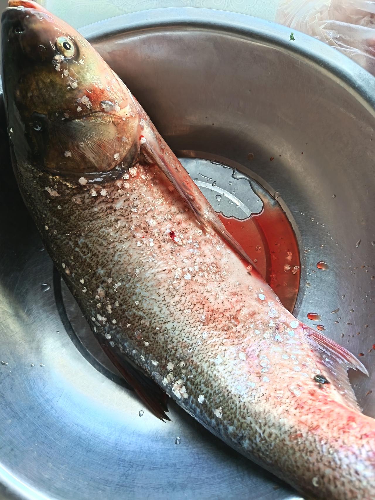 今天鱼价: 草鱼每斤14元 青鱼每斤15元 黑鱼每斤17元 鲢鱼每斤4元 以上4种鱼,是养殖户在鱼塘养的。全靠吃鱼饲料养大的,因鱼种不同,价格也有相差比较大的。 反正都是家养的,我果断选择了价格低的鲢子。便支付了14块钱,买了一条4斤1两的链子。 用这条鱼的正身做个泡菜鱼,鱼头和鱼尾加上1个青萝卜烧汤,一菜一汤便可搞定!