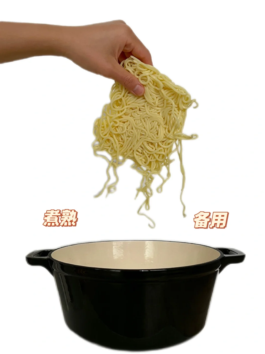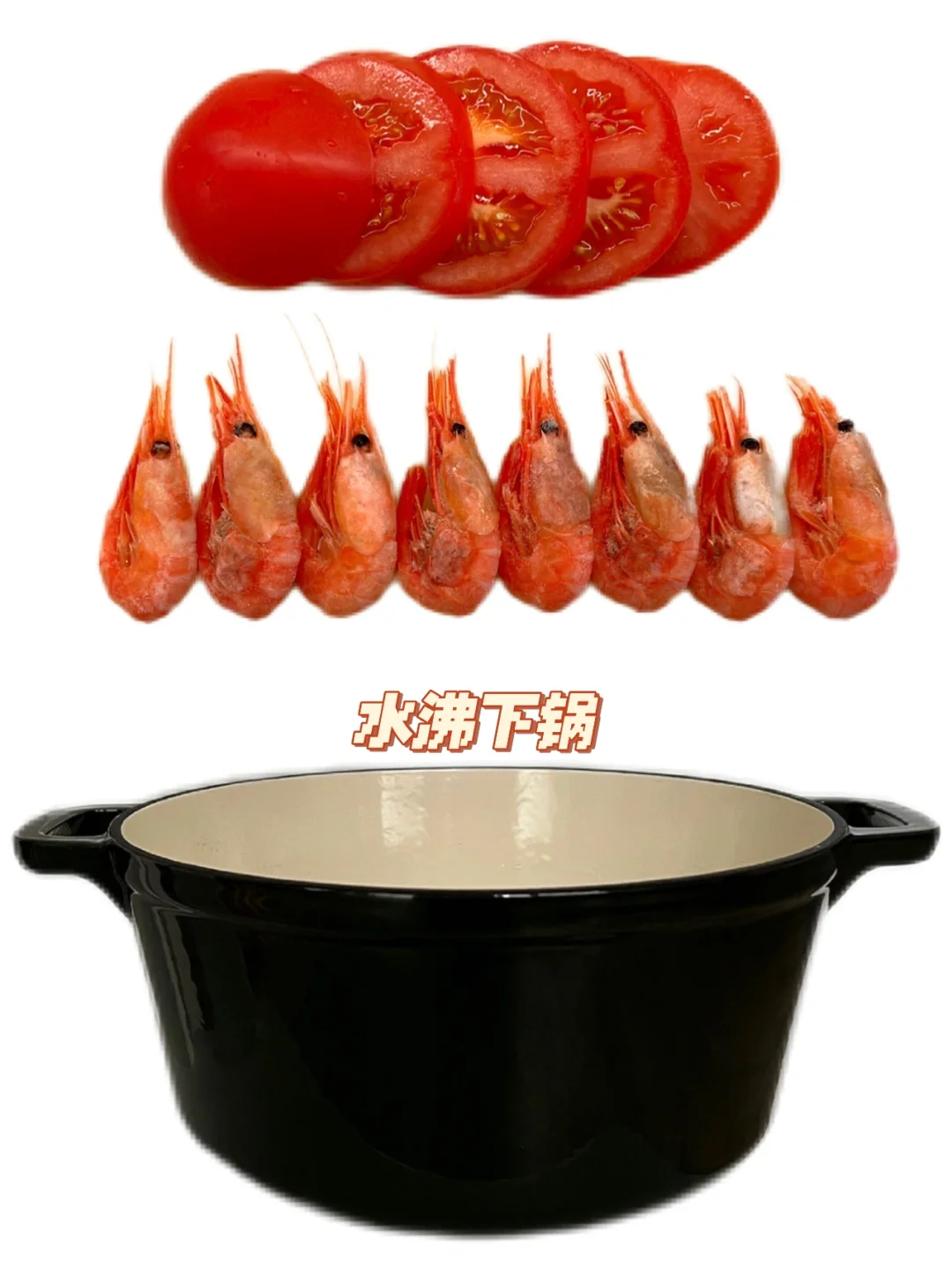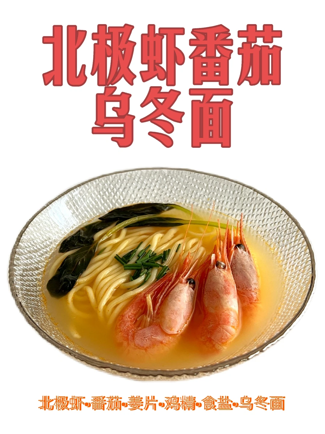 单吃是番茄虾汤 把汤浇在面上吃是番茄虾汤面 汤的热量很低 减肥减脂可把面换成魔芋丝或豆腐 ***温馨提示*** 用本地超市的浓缩鸡汤料煮 是康*傅鲜虾鱼板面的味道 怀念的话可以试试 ***进入做法解说*** 北极虾冷水冲洗把扎嘴的碎虾皮冲走 (铁嘴可略过不洗) 乌冬面煮好后捞出备用 换水再煮汤 水沸后其余材料一起下锅里煮20分钟 把汤浇在煮好的乌冬面上即可 食材调料比例按个人口味调整 汤的锅底会有沉淀的碎虾壳 需小心 加一点点🤏糖可提鲜
