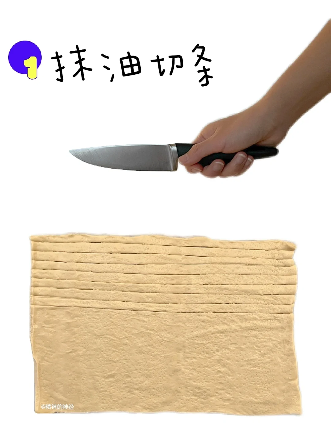 每篇只能放9⃣️张图 卤子做法放在下个笔记 披萨皮先在室温放置30分钟再做 油稍微多倒一点 放少了沾手 不好揪 沿线切可以把整张披萨皮盘成圈 而且中间不会断开 这样盘起来盖上保鲜膜放冰箱 第二天也不会粘在一起 (实测结论) 不过确实没必要 切成一条一条的 吃几条切几条 剩下的再卷起来包上放回冰箱 这样操作很方便