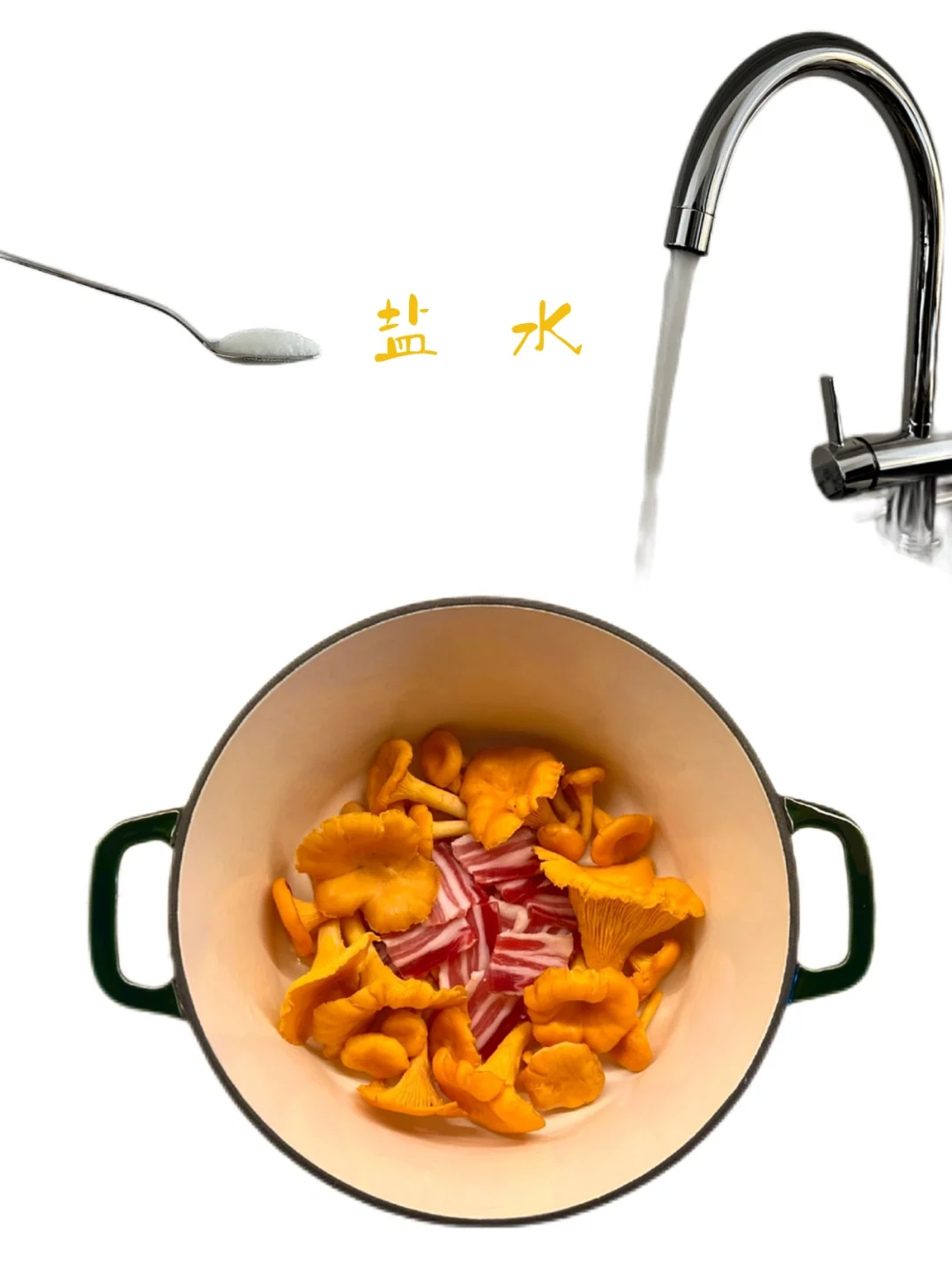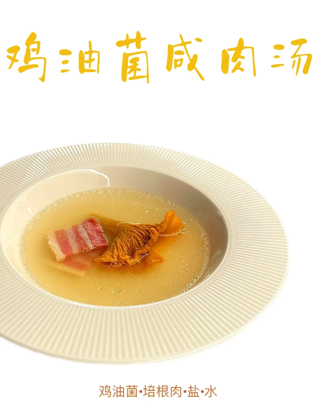 第2⃣️道菜 鸡油菌咸肉汤 是季节限定的鸡油菌哇! 这真是一点技术含量都没有 东西全扔锅里 水沸后煮20分钟就可以了 盐根据口味适量添加 水量不能盖过食材 水越少 汤越浓 味越鲜 水放多了可加鸡精补救 不怕麻烦的话可用姜片大葱段炖鸡汤 然后再用汤煮培根肉和鸡油菌 这样是最鲜的 装盘时少放几块干货 听说这样看起来会‘贵’气些 [看R]