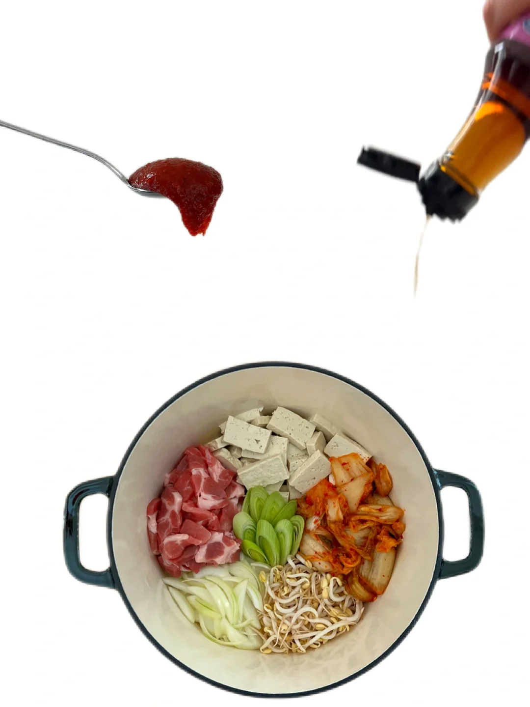 喜欢偏酸一点就多放辣白菜,喜欢偏辣一点就多放韩式辣酱。