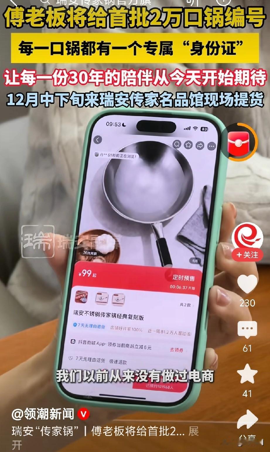“传家锅”爆火,这不仅对“锅业”而言是一场毁灭性打击,对“传家锅”自身来说,也未必是件好事。 “传家锅”火得莫名其妙。有个女子想找锅的生产厂家,还真找到了。 那是一家已经倒闭的厂子,老板决定重整旗鼓,这原本是个不错的故事。 然而,太火了便成了麻烦。 当初隔壁天水爆火,我们陇西人看着眼馋。我当时就说,别眼馋,咱接待能力有限,来几千游客还行,上万游客根本接待不过来。 况且陇西特色小吃店就那么几家,能接待多少人呢? 如今“传家锅”也面临同样的难题。 它生产力有限,可全国网友都想买一口价格实惠的“传家锅”。 仓促生产,质量会不会下降? 如此巨大的流量,考验的是“传家锅”的生产能力、接单能力以及物流快递能力。只要一个环节出问题,“传家锅”的口碑就会受损。 这些还只是小事。“传家锅”真有那么神,真的不粘锅吗? 一旦这个神话被戳穿或打破,麻烦就大了。 还有个严重问题,连我这种不追流量的人都想扔掉家里的锅,换一口“传家锅”。 这意味着,“传家锅”出现后,其他锅将毫无业绩。很快,众多造锅、卖锅的企业会倒闭,店铺会关门,这可是个大麻烦。 大家怎么看呢?