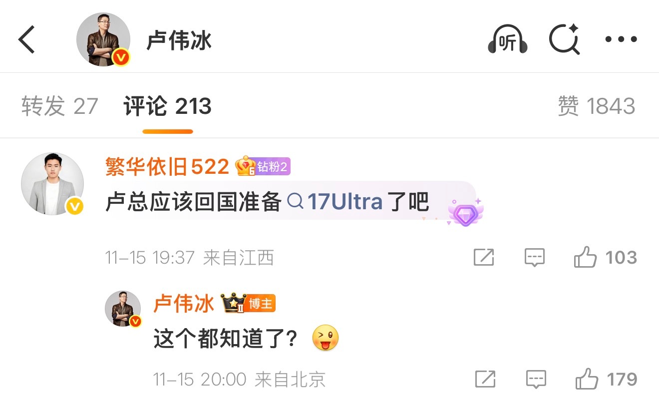 😂还在想今年旗舰机是不是全部发布完了。结果刷到个帖子看到卢总回复了 17Ultra,还以为是 ps 的看来真是要年底前发布了么