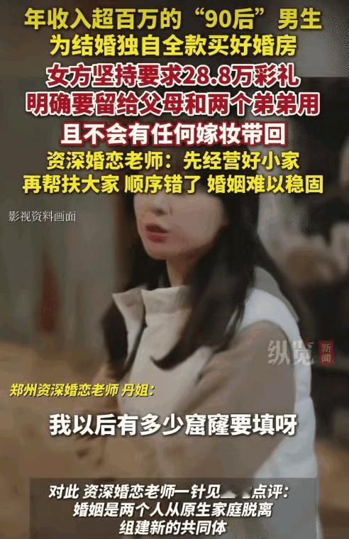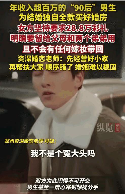 百万年薪男与28.8万彩礼女分手!矛盾焦点:彩礼全数留给父母和两个弟弟,且无一分嫁妆。网友热议:这究竟是传统习俗,还是“扶弟魔”的现代演绎? 纵览新闻11月25号的一篇报道,在网上引起了不少讨论。 主角是个90后男生,凭着自己一路打拼,年收入早就过了百万。 到了谈婚论嫁的年纪,他和交往了一段时间的女朋友商量结婚,为了表诚意,没让女方家出一分钱,自己全款买好了一套婚房,就等着领证办婚礼,把日子过起来。 按说男方做到这份上,诚意已经拉满了,可没成想,谈彩礼的时候,双方闹了个不可开交。 女方直接提出,要28.8万的彩礼,这个数字不算小,但让他没法接受的是后面的话。 女生说这笔钱要全部留给她爸妈,还要拿一部分给两个弟弟用,至于嫁妆,女方明说没有,一分钱都不会带到小家里来。 男生听到这话就愣住了,他不是拿不出这28.8万,而是没法理解这个要求背后的想法。 他自己攒钱买房,是想着给两个人的小家打基础,可女方张口就要把一大笔彩礼全贴回娘家,还专门提了要给两个弟弟,这让他心里犯起了嘀咕。 他试着和女方沟通,说结婚是两个人组建新家庭,得先把小家顾好,可女方态度很坚决,觉得自己的要求合情合理,没半点商量的余地。 就因为这事,两个人从一开始的商量变成了争吵,之前攒下的感情也跟着降温。 男生心里越来越寒,他不是心疼那笔钱,是从这件事里看到了更关键的问题。 女方心里,原生家庭永远排在小家前面,尤其是对两个弟弟,那种要全力帮扶的态度,让他不得不往深了想。 真要是结了婚,这28.8万恐怕只是个开头,以后弟弟读书、买房、娶媳妇,女方是不是都要从两个人的小家里拿钱补贴? 自己这哪是娶媳妇,分明是要养着女方一大家人,成了专职扶贫的了。 身边的人知道这事后,大多都觉得女方的要求有点过了。 有朋友劝男生,这不是钱的事,是婚姻里的主次问题,要是一开始就拎不清,以后的日子有的是糟心。 网上的网友也吵翻了,有人说“娶妻不娶扶弟魔”不是没道理,这种无底洞填不完。 也有人觉得彩礼是传统,给点也应该,还有人站在中间说,关键看彩礼用途,要是给小家用就合理,全给弟弟就说不过去。 这事往深了说,反映的是现在很多年轻人结婚都会遇到的问题,原生家庭和小家的边界到底在哪? 像这个女生,可能从小就被灌输要帮衬弟弟的想法,压根没意识到结婚后,自己首先是小家庭的一员,得和丈夫一起把小家经营好,再有余力才能去帮衬娘家。 这种边界感的缺失,往往就是婚姻矛盾的导火索。 婚姻里最讲究的就是互相付出,不是单方面的牺牲。 男生全款买房是付出,女生要是真心想好好过日子,就该考虑怎么和男生一起把小家建设好,而不是一门心思想着用彩礼补贴娘家。 要是连婚前都没法就“先顾小家”达成共识,婚后只会因为钱、因为原生家庭的琐事吵得更凶。 男生动了分手的念头,也不是一时冲动,他怕的不是28.8万,是怕婚后无尽的索取,怕自己的付出永远填不满女方原生家庭的窟窿。 结婚是为了找个伴一起好好过日子,不是为了给自己找一堆负担。 这件事也给很多准备结婚的人提了个醒,婚前把丑话说在前面,把小家和原生家庭的边界划清楚,不是算计,是对婚姻最基本的负责。