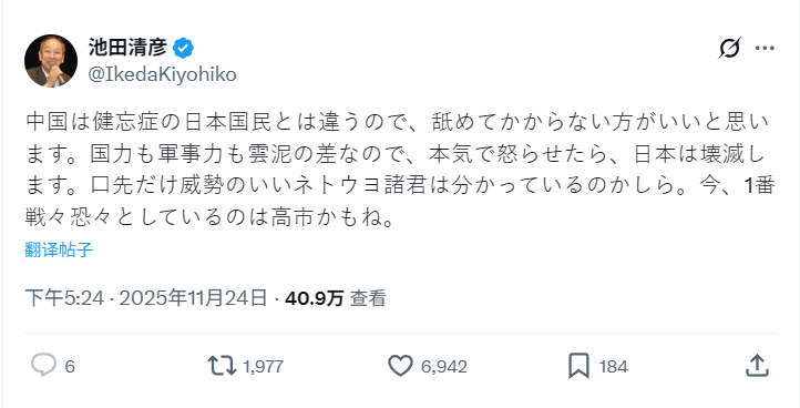 早稻田大学名誉教授池田清彦:“中国和健忘症的日本国民不同,所以最好不要小看他们,中日国力和军事力量都是天壤之别,如果真的激怒了他们的话,日本就会毁灭。我倒想知道你们这些只会夸夸其谈的右翼是否意识到这一点。现在最战战兢兢的可能是高市。“