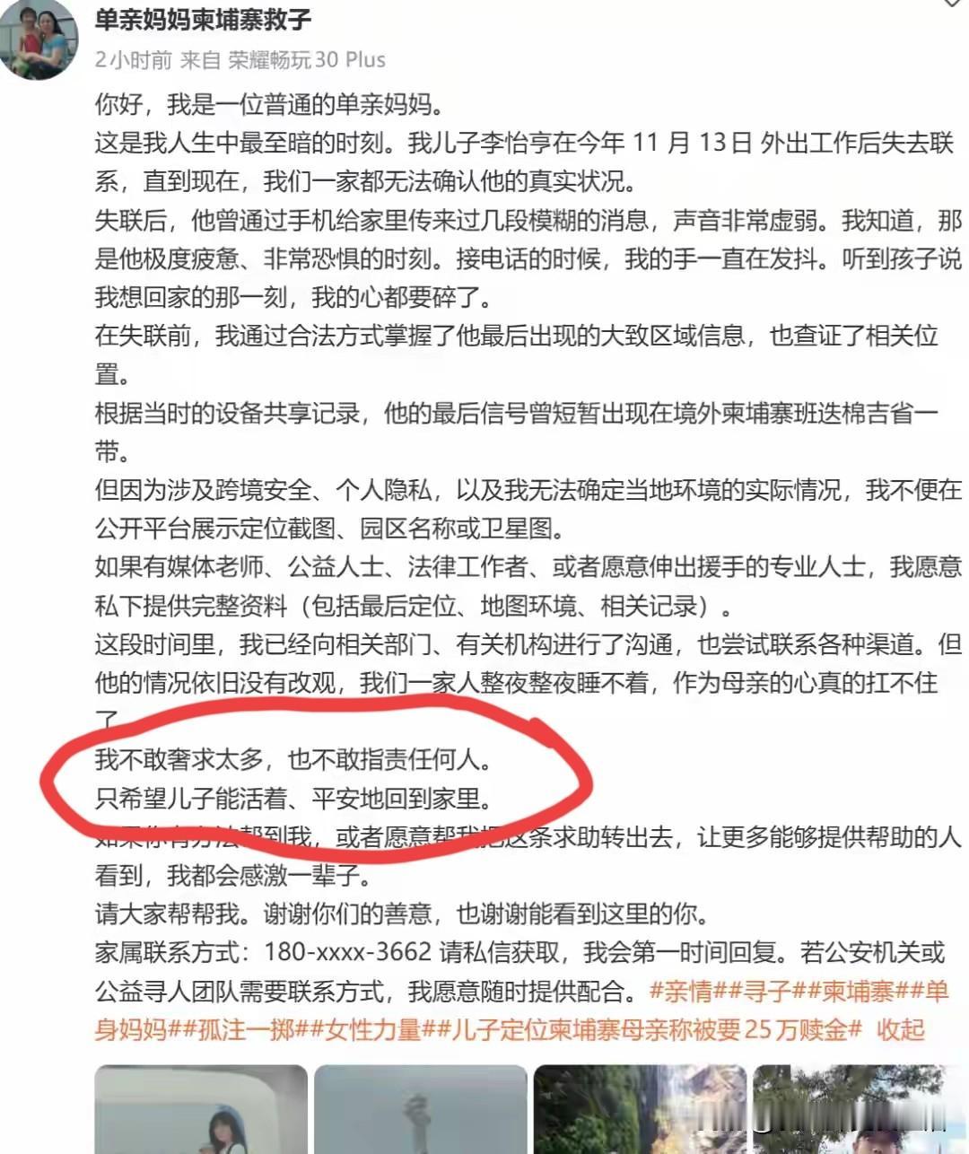 又一个在柬埔寨失联的。 这一次是歌手仝卓的表弟。 能看得出来家属非常焦虑,但是还非常克制,就是不想自己的言论给有关部门惹任何麻烦。 但是在没有任何进展的情况下,只能在网络上呼吁了。 看介绍应该是失去联系10天了,期间有对话联系,但语气很微弱。 但愿可以平安归来。