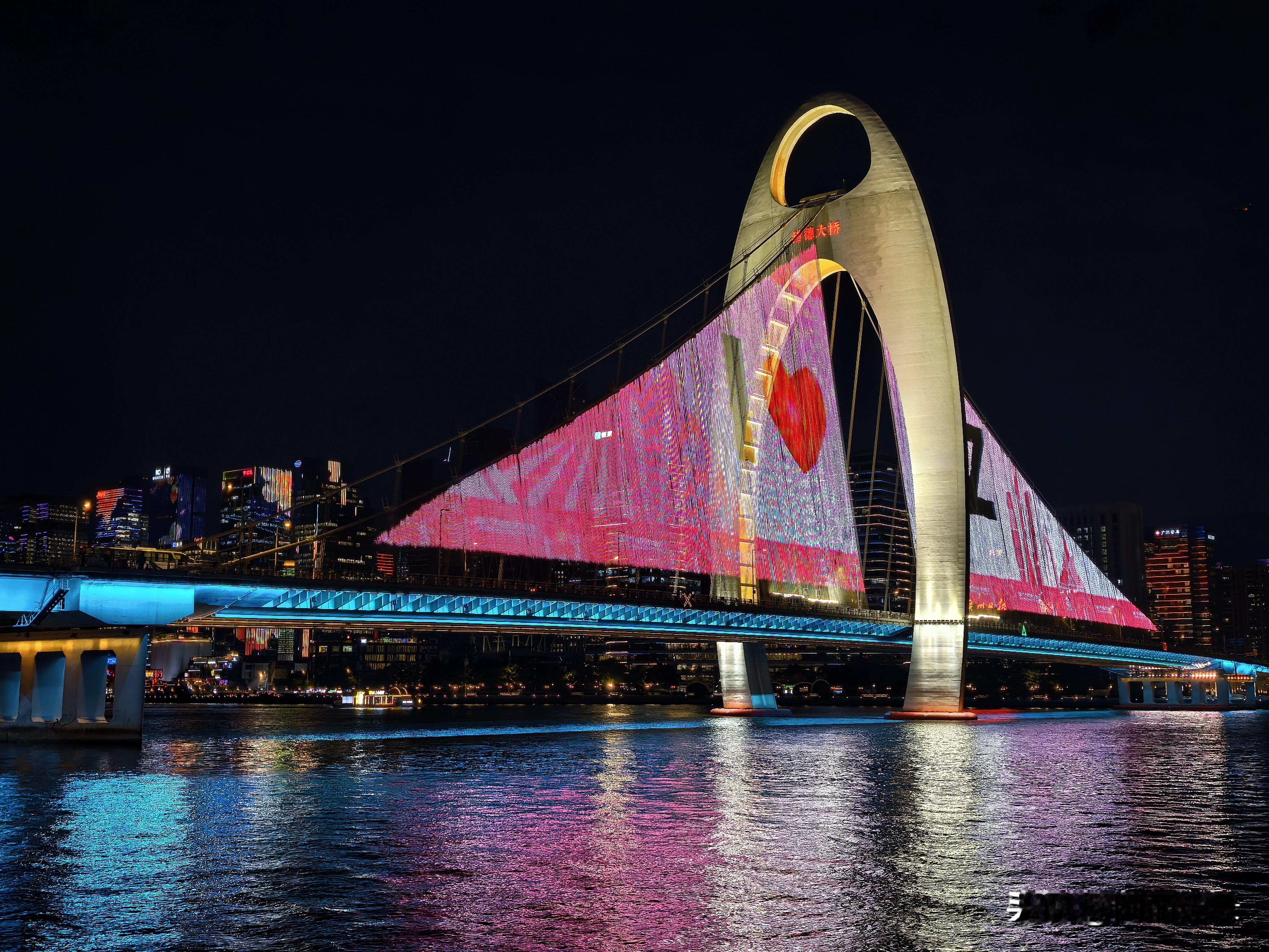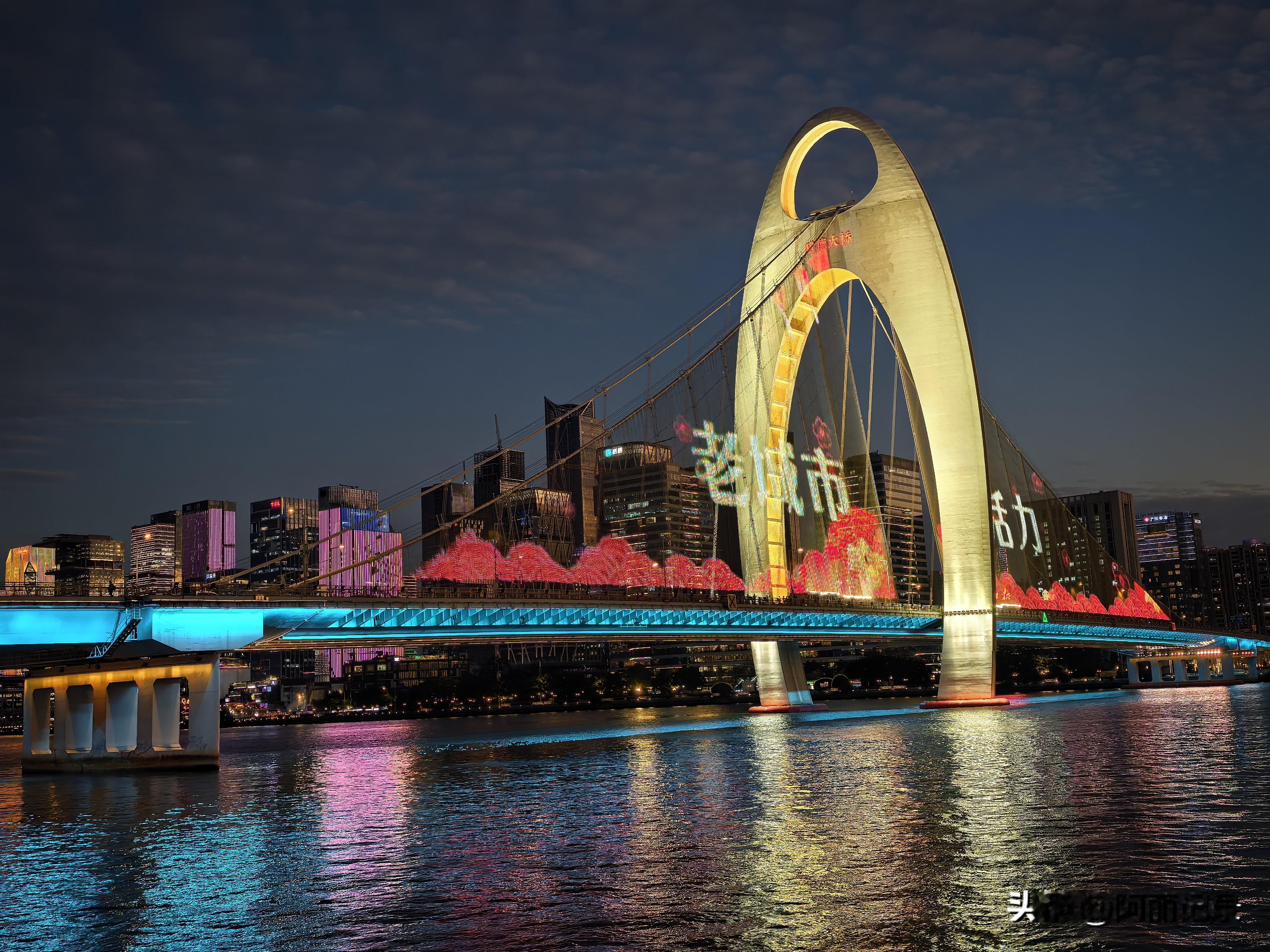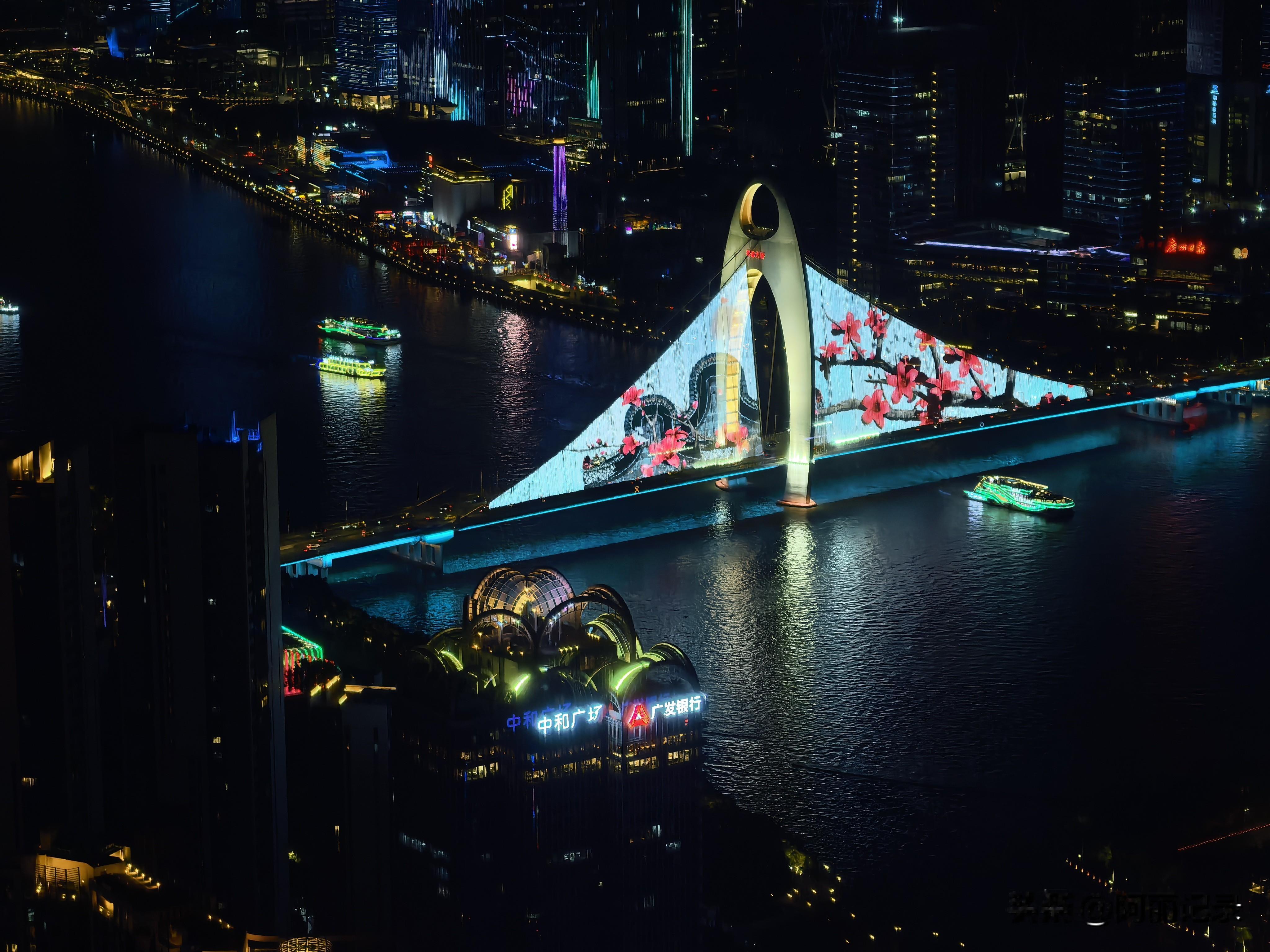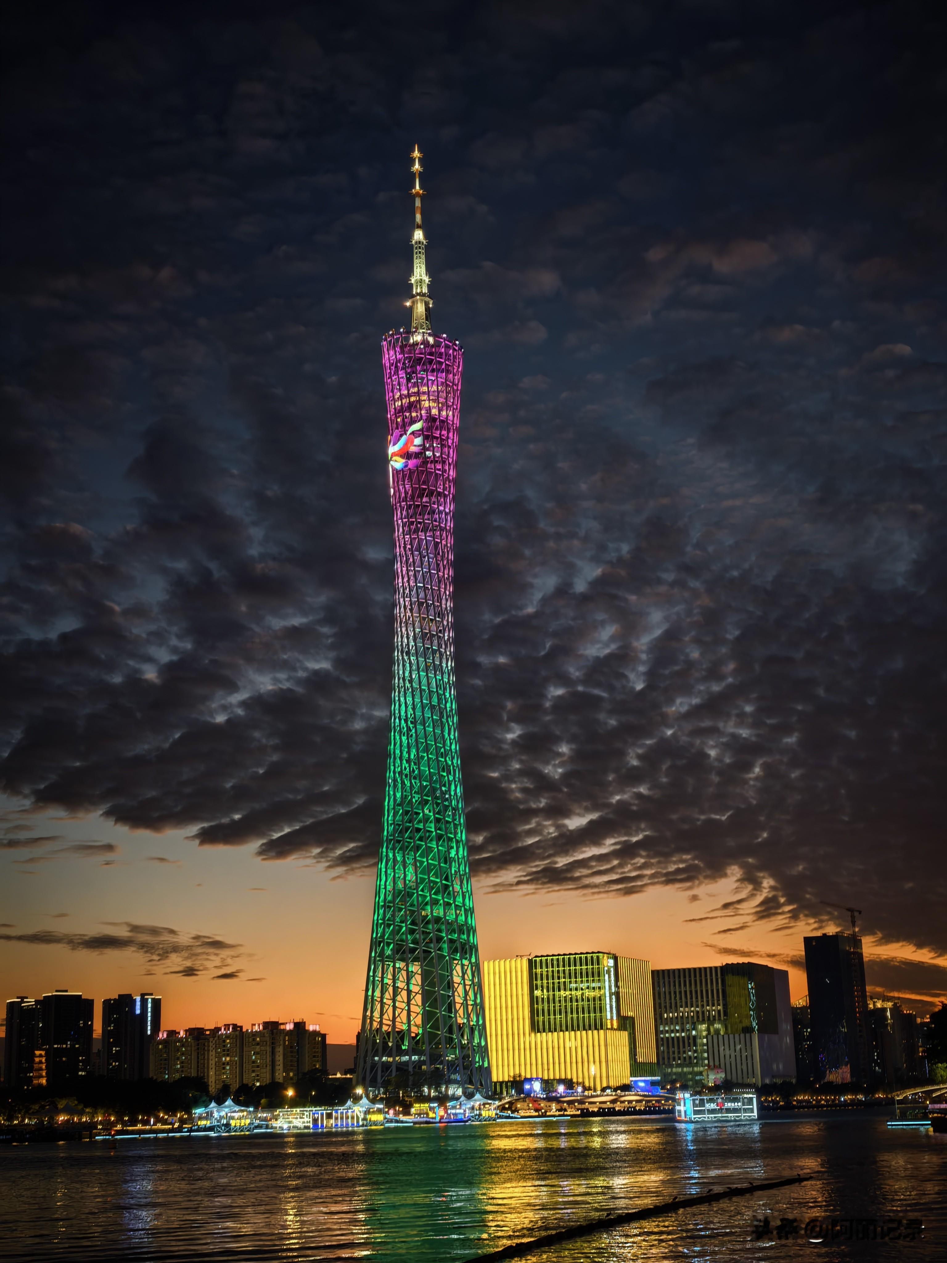 来广州正赶上广州国际灯光节,第一次看广州珠江新城的夜景,真是太美了! 珠江两畔,灯光璀璨,猎德大桥在灯光下,变幻着不同的灯光图案,15届全运会的卡通吉祥物喜洋洋、乐融融不断呈现。 广州标志性建筑小蛮腰(广州塔)的灯光秀,更是绚丽多彩。 小蛮腰灯光以全运会和湾区新韵为主题 ,“海天霞、菡萏粉、芰荷绿”为活力主题色,包含“绽放”“荣耀”“攀登”“星空”等篇章,展现全运盛会的蓬勃朝气与体育精神的永恒传承。 “激情全运会,活力大湾区”,的灯光字幕频频闪烁! 广州灯光节11月26日结束,来广州一定不要错过这美丽的夜景!