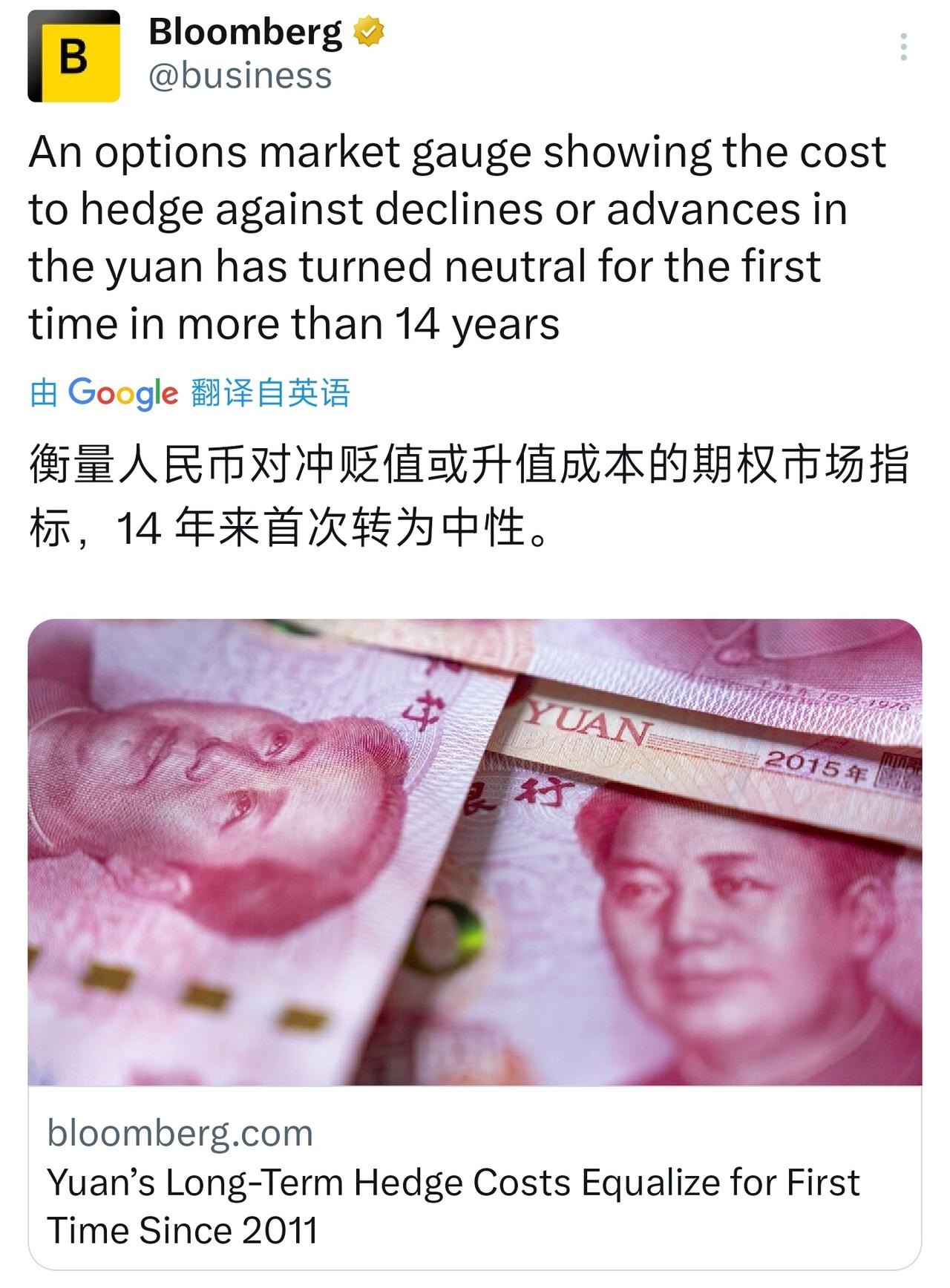 人民币升值开始加快了! 年内人民币升值首次到达7.08! 预计年末破7.0! 彭博社分析: 自2011年7月以来的14年间, 首次出现了中性现象: 即人民币升值期权指标超过贬值指标! 高盛上周也上调了在岸人民币汇率目标, 理由是对中国出口和国家经常账户盈余持乐观态度。