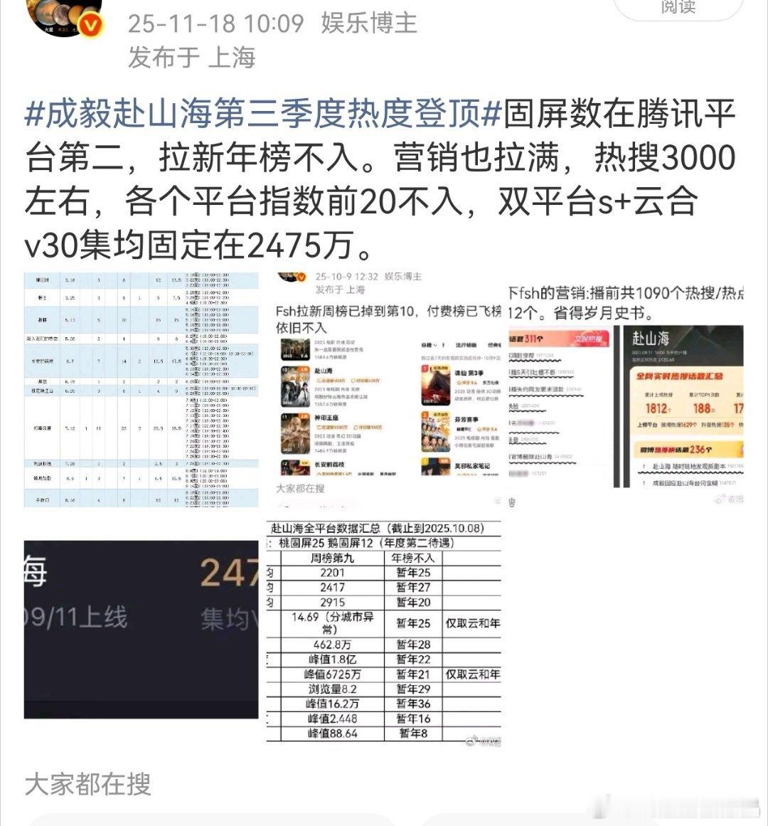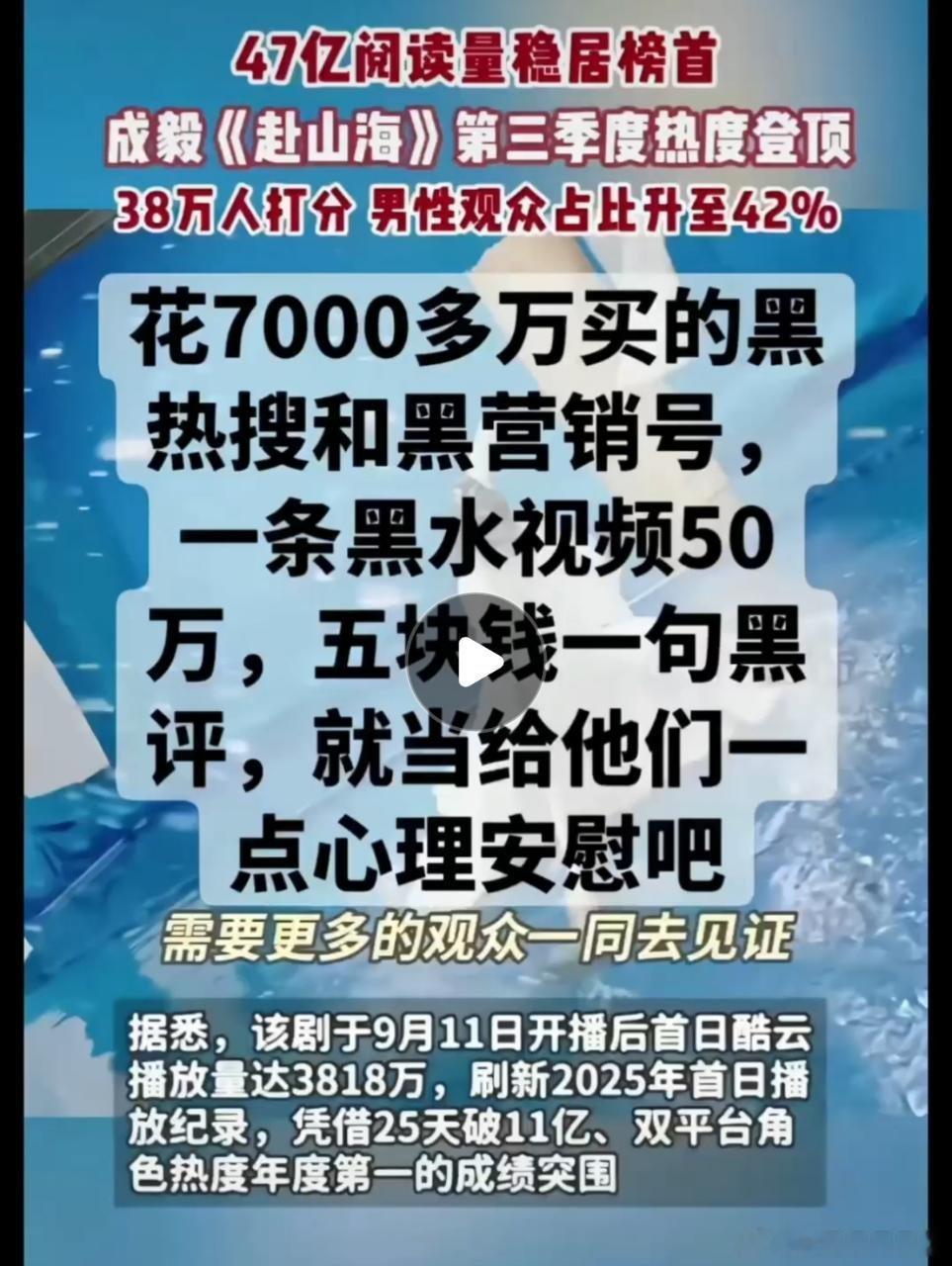 看看他的历史成绩,再看看赴山海的成绩:腾讯固屏数第二,拉新年榜不入;热搜3000+,各个平台指数不入前20,腾讯爱奇艺双平台无竞争对手剧,结果云合v30才2475。谁钱多的慌花7000万去黑它?一切只是为了图6的岁月史书,营造“长尾效应”。