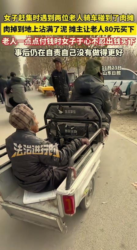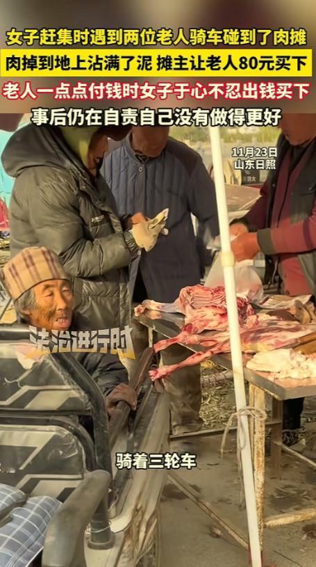 “太感人了!”山东日照,一大爷骑着三轮车带老伴去赶集,没留神蹭掉了肉摊上一块肉,摊主当即要求大爷花80元买下,大爷自知理亏,颤巍巍的掏出一把零钱凑了半天,也没数清。路过的女子实在看不下去了,上前果断对摊主说:“你把钱给他吧,我要这个肉了!” 据法治水城11月25日报道,那天集市上人挤人,一个大爷骑着三轮车,后座上带着他的老伴,在人群里慢慢地往前挪。 路过一个肉摊的时候,大概是没注意,车把蹭了一下,摊位上挂着的一块羊肉应声掉到了地上,地上尘土多,这肉算是废了,没法再卖。 肉摊老板一看,就不干了,走过来说这肉你得买下,80块,大爷知道是自己不小心,理亏,也没争辩,就开始从兜里掏钱。 可他掏了半天,掏出来一把皱巴巴的零钱,一块的、五块的,最大的也不过十块,他把钱摊在手心里,手指哆嗦着数了好几遍,额头上都见了汗,看样子是凑不够这80块。 他身后的老伴一直低着头,一句话也不说,那神情看着就让人心酸,周围看热闹的人越来越多。 就在大爷最窘迫的时候,旁边一个配钥匙的摊主也走了过来,他的摊位就在肉摊旁边,刚才的碰撞也把他的配钥匙机器给带倒了,机器外壳摔掉了一角。 他指着自己的机器,对着本来就急得不知道怎么办的大爷说,你也得赔我80块,这下大爷彻底愣住了。 前一个80块还没解决,后一个80块又来了,他拿着那把零钱,呆在原地,完全不知所措。 幸好,这时人群里走出来一位好心的女子,她二话没说,直接替大爷付了80块肉钱,解了第一个围,肉摊老板收了钱,把大爷数了半天的零钱还给了他。 可问题是,配钥匙摊主的索赔还没完,他看着大爷刚刚拿回那把零钱,依然坚持要他赔偿80块。 他的机器确实被碰倒了,要求赔偿听起来合情合理,但让人觉得不舒服的是,他明明亲眼看到了大爷为了80块钱有多为难,也看到了大爷全身上下就那么点零钱,但他没有丝毫的体谅。 一个塑料外壳摔掉一个角,到底值不值80块?这机器是不是真的就没法用了?这些问题他根本没提,他只是在老人最无助、最尴尬的时候,又狠狠地推了一把。 这种行为,很难不让人怀疑他是在“看人下菜碟”,觉得老人老实好欺负,如果今天碰倒他机器的是个横眉立目的壮汉,他还会这么理直气壮地要80块吗?这件事被发到网上后,网友的评论几乎一边倒地指向了这位配钥匙的摊主。 大家普遍认为,肉摊老板要80块钱,虽然有点贵,但毕竟一整块肉都废了,还算情有可原,而这个配钥匙摊主,为一个边角料的损伤就要80块,就有点讹人的意思了。 其实大家愤怒的,不只是这80块钱本身,更是这背后透露出的冷漠和精于算计,在自己的利益面前,他选择了最简单粗暴的方式,完全无视了他人的困境。 这种做法,就算在规则上挑不出大毛病,但在人情上却输得一败涂地,社会是需要规矩,损坏东西要赔偿,这是常识,但规矩之外,还有人心。 善良,很多时候并不需要你付出多少,仅仅是在别人有难处的时候,能稍微体谅一下,宽容一点,如果这位摊主当时能说一句“算了,老大爷,没什么大事”,或者象征性地要个十块二十块的修理费,那么事情就不是现在这样了。 但他没有这么做,最终,还是那位好心女子再次出手,又替大爷付了这80块钱,两位老人才得以离开。 这位女子花钱不多,但她的做法和那个配钥匙摊主的冷漠一比,简直是天壤之别,她让我们看到了,就算是在最普通的菜市场里,善良和温暖也一直都在。 而那个摊主的做法也给所有人提了个醒:做人,可以盘算自己的小九九,但不能没良心,可以想着自己的利益,但不能踩着别人的难处往上爬。 信源:法治水城2025-11-25——女子赶集时遇到两位老人骑车碰到了肉摊 肉掉到地上沾满了泥 摊主让老人80元买下 老人一点点付钱时女子于心不忍出钱买下 事后仍在自责自己没有做得更好